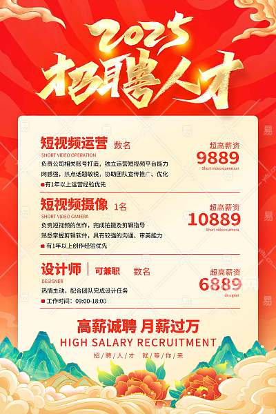 红色喜庆2025招聘海报设计2025蛇年新年招聘海报2025蛇年新年招聘文案海报