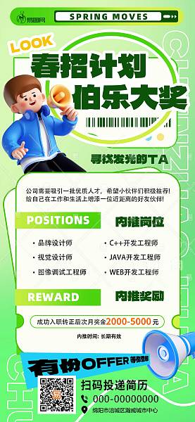 春季招聘春招潮流人物喇叭绿色渐变3D海报宣传海报