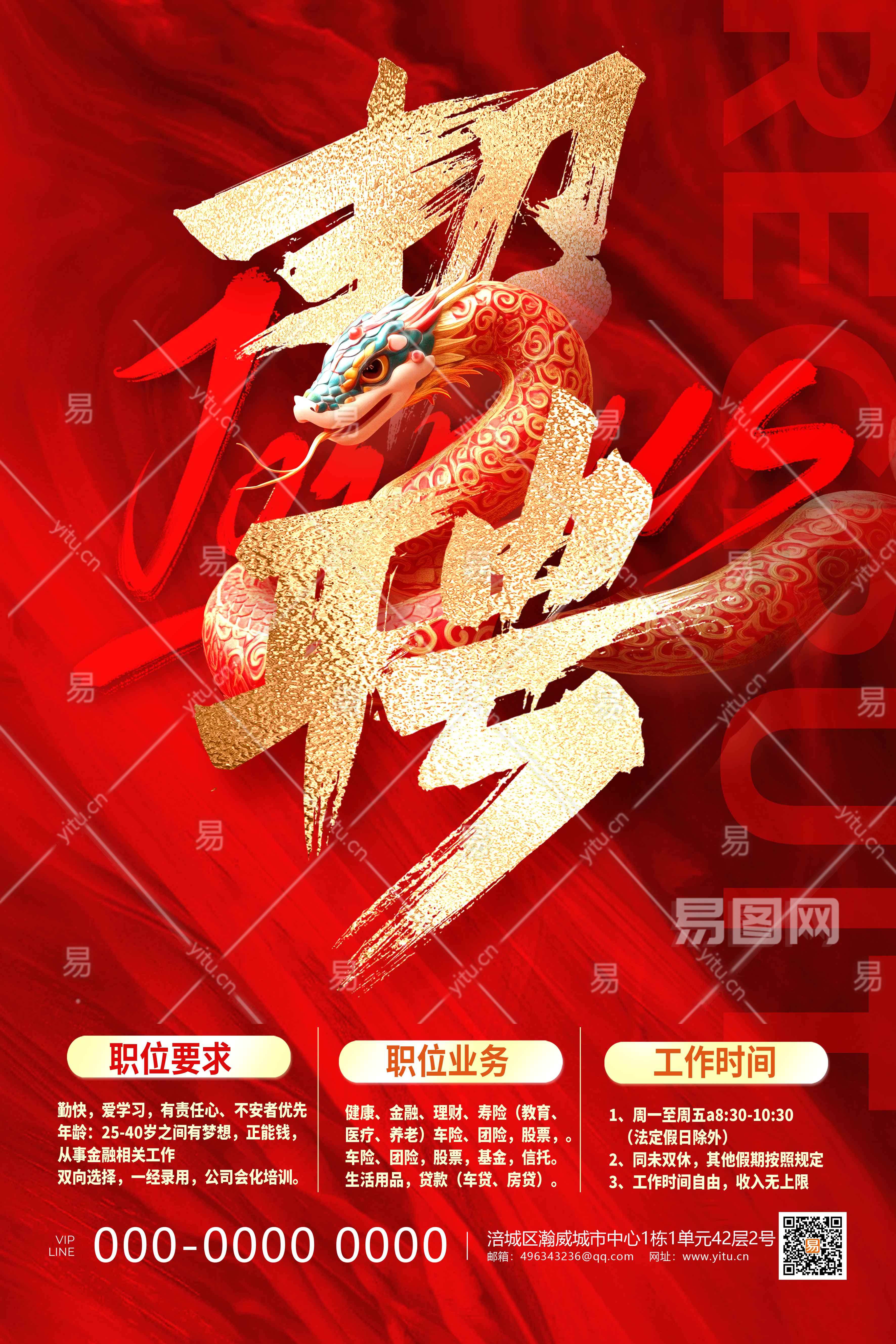红色2025蛇年招牌海报设计蛇年招聘海报