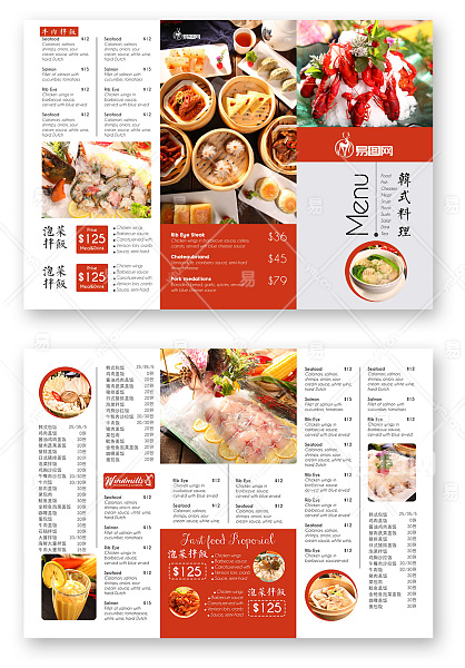 当前的位置:首页 > 广告设计 > 画册/装帧 > 菜谱设计 > 红色美食料理菜单三折页
