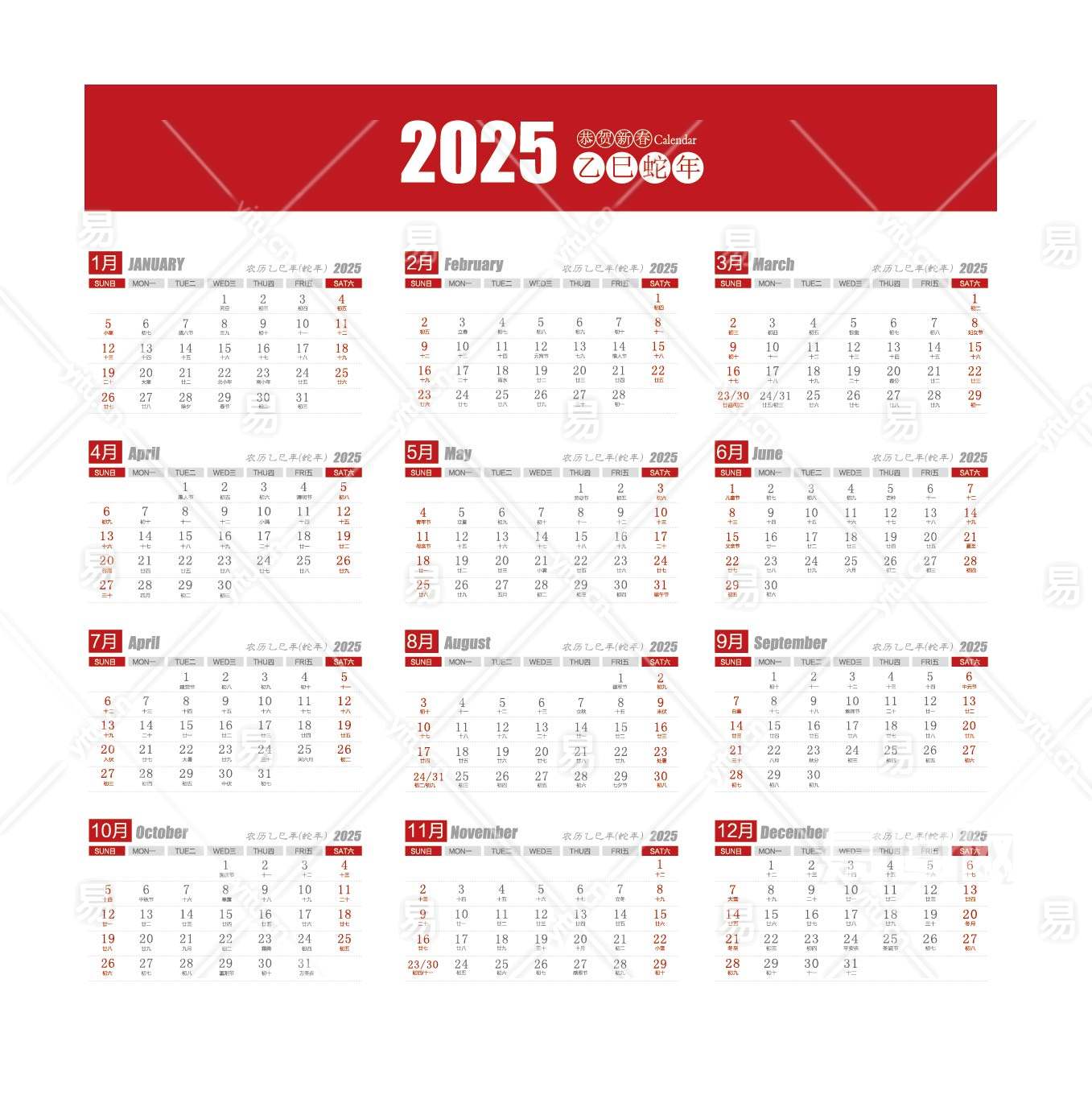 红色简洁大气2025台历挂历