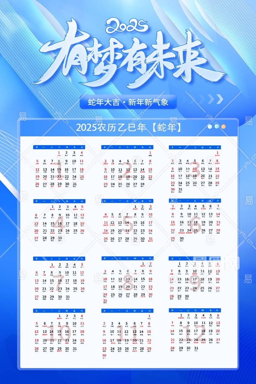 蓝色插画风格2025蛇年科技有梦有未来日历挂历2025蛇年日历