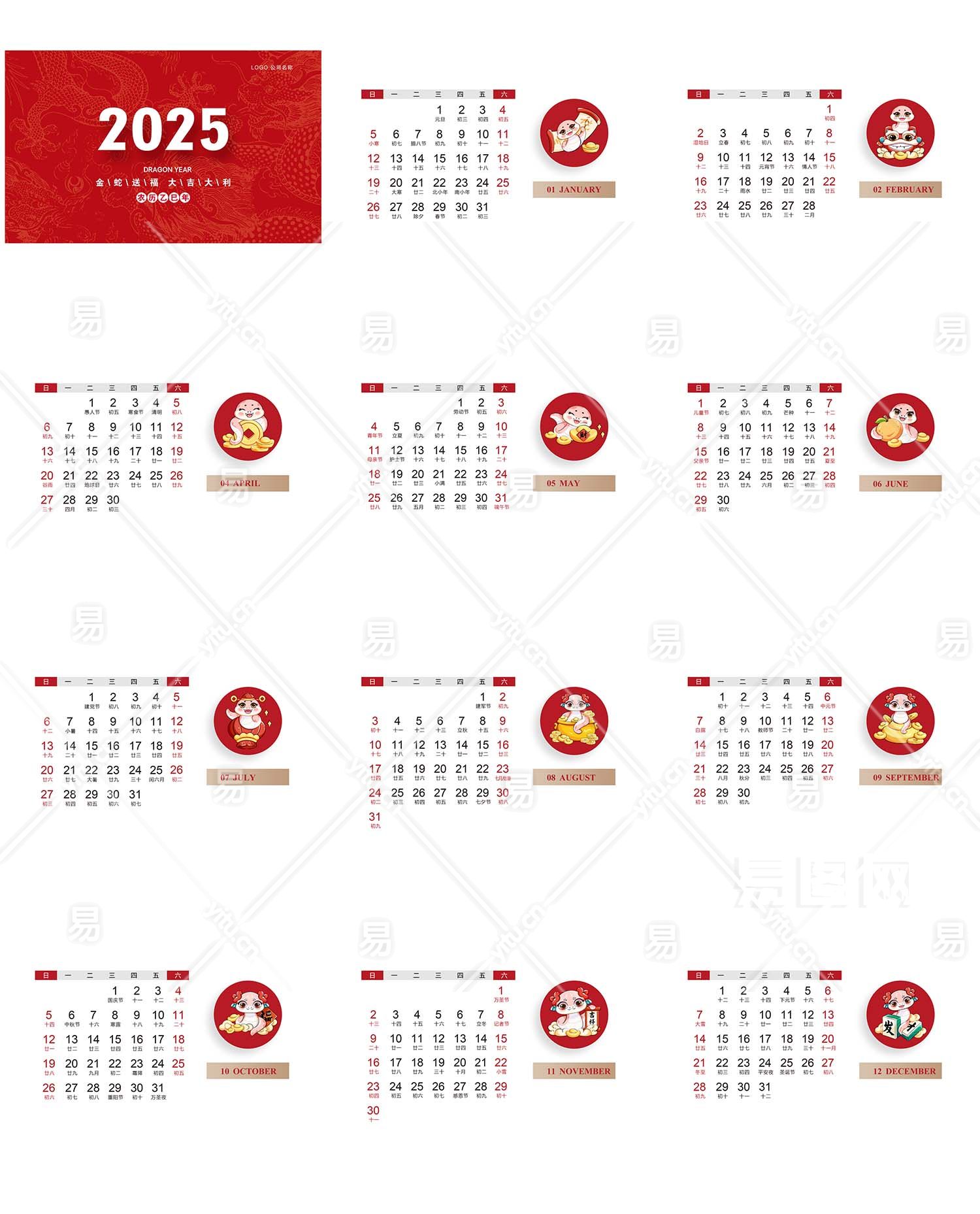 红色蛇年2025日历