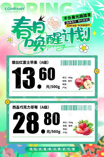 绿色渐变色小清新风格春日唤醒计划春季促销超市价格信息牌春季促销