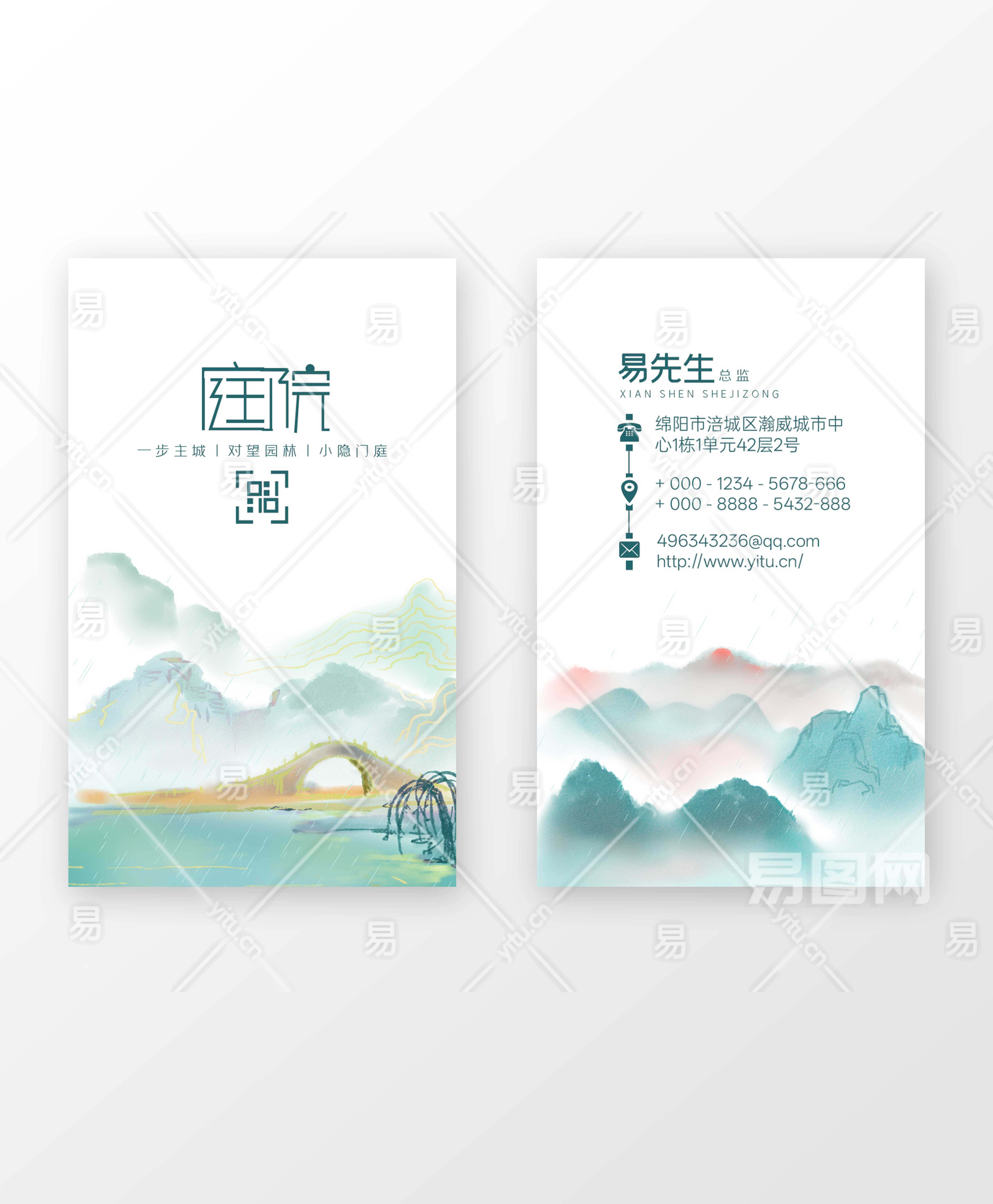 当前的位置:首页 > 广告设计 > 名片/卡证 > 商务名片 > 青色白色高档古风山水地产名片