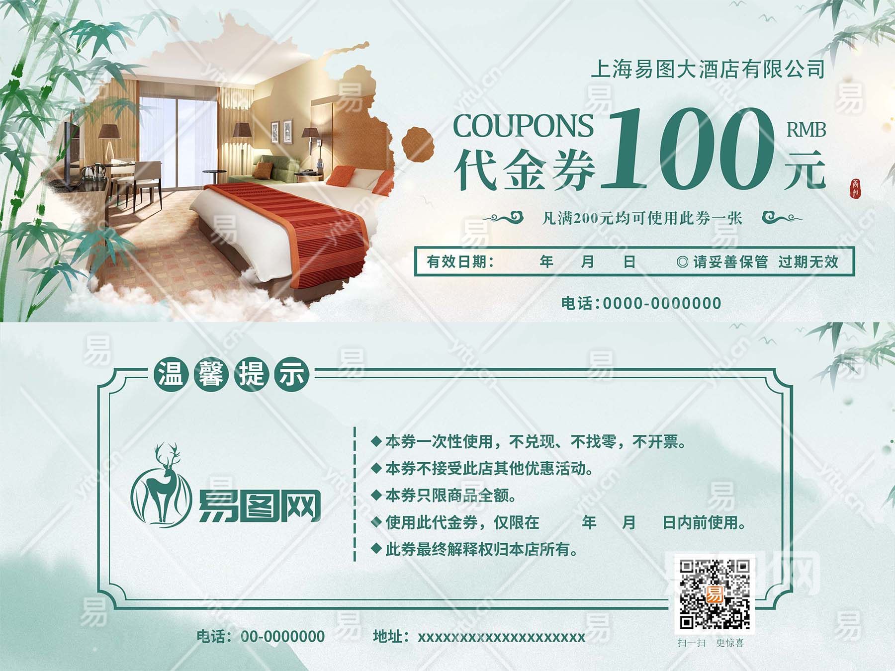 绿色中国风水墨水彩代金券酒店客房宾馆代金券优惠券