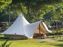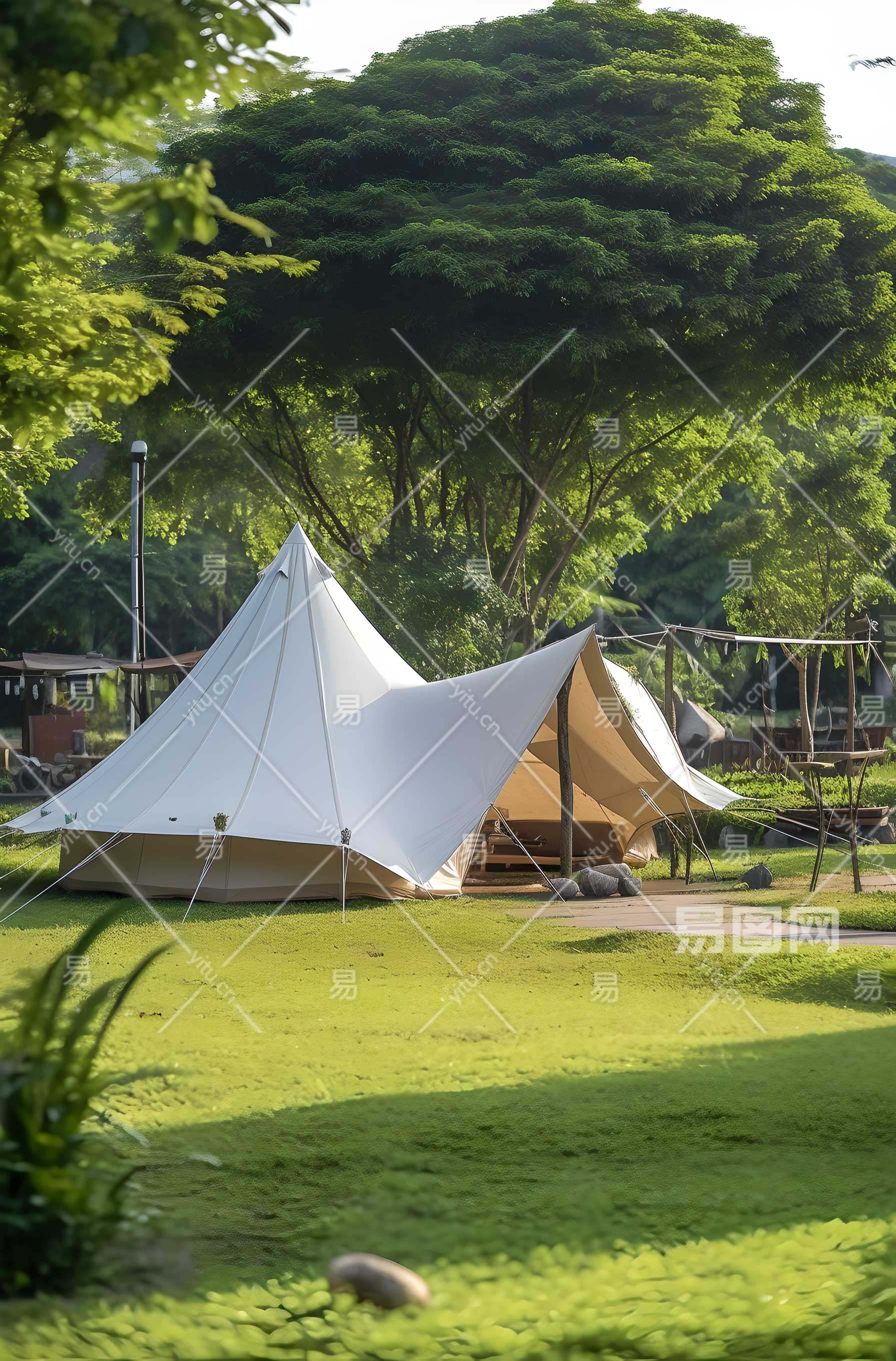 清晨的阳光照在草地和露营帐篷上