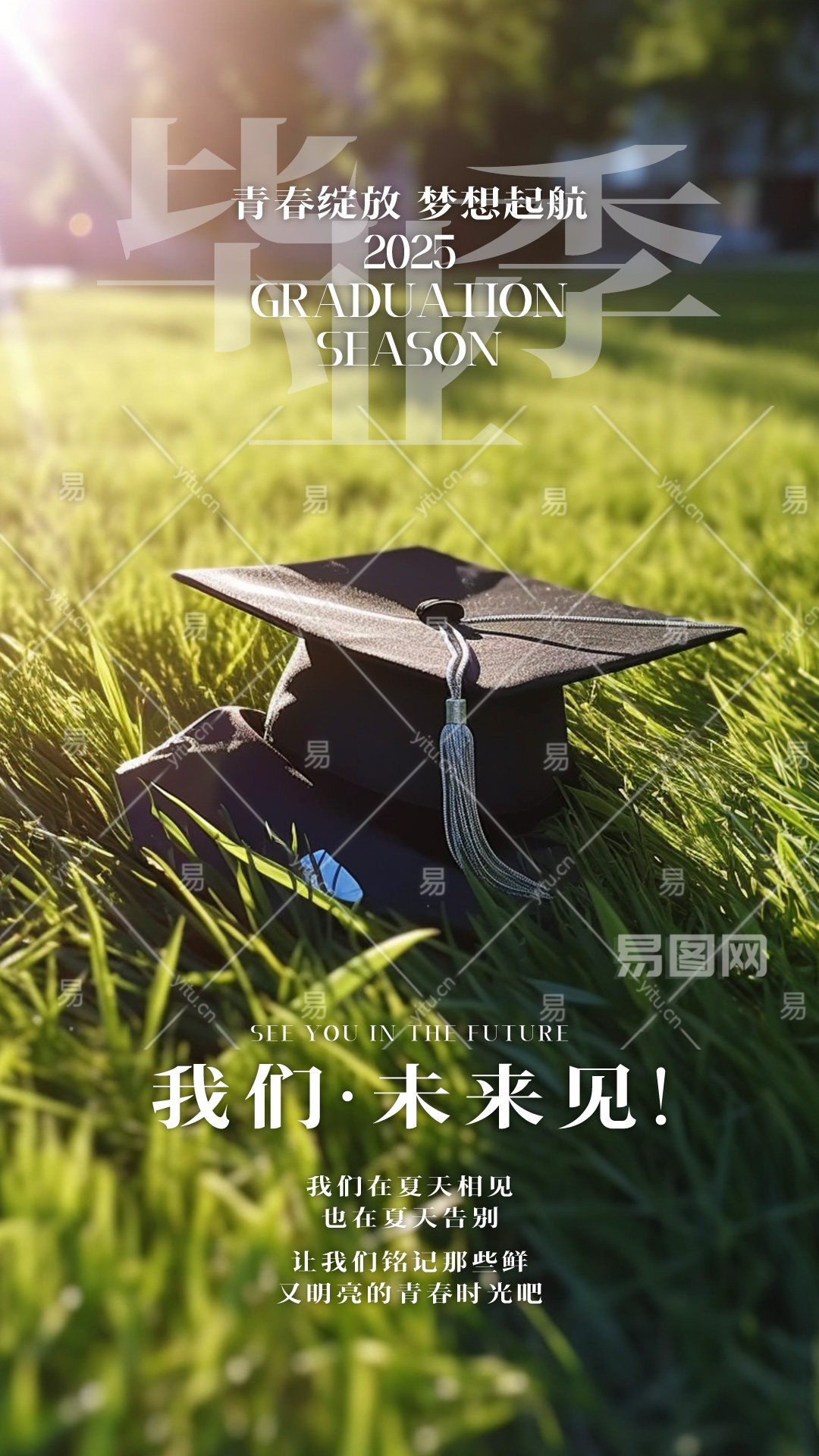 时尚简约博士帽草地夏日毕业季宣传海报