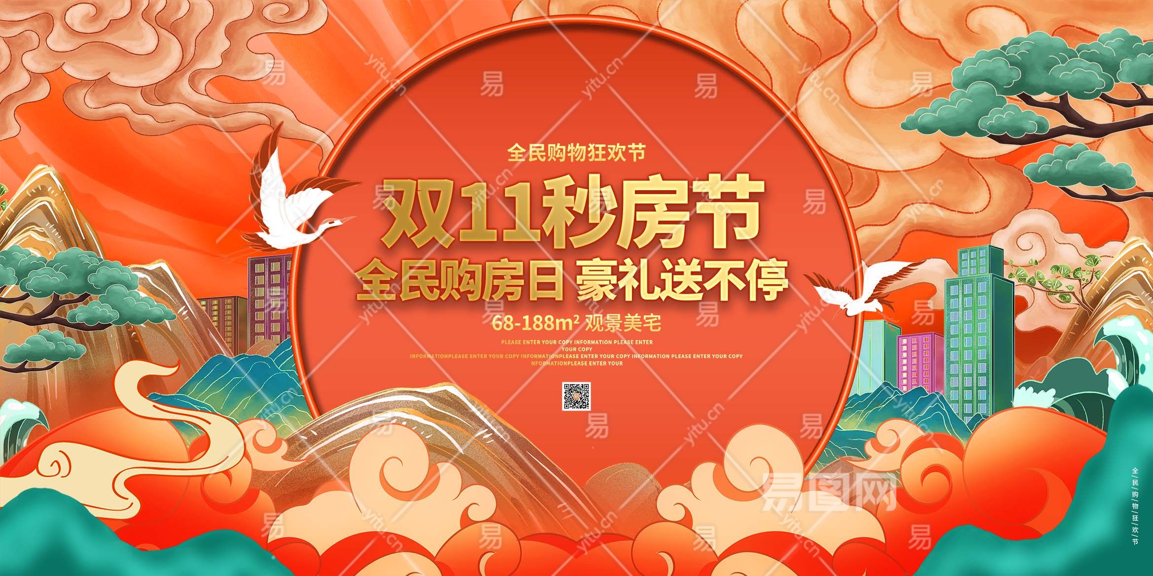 国潮风约惠双十一双十一秒房节双11宣传展板
