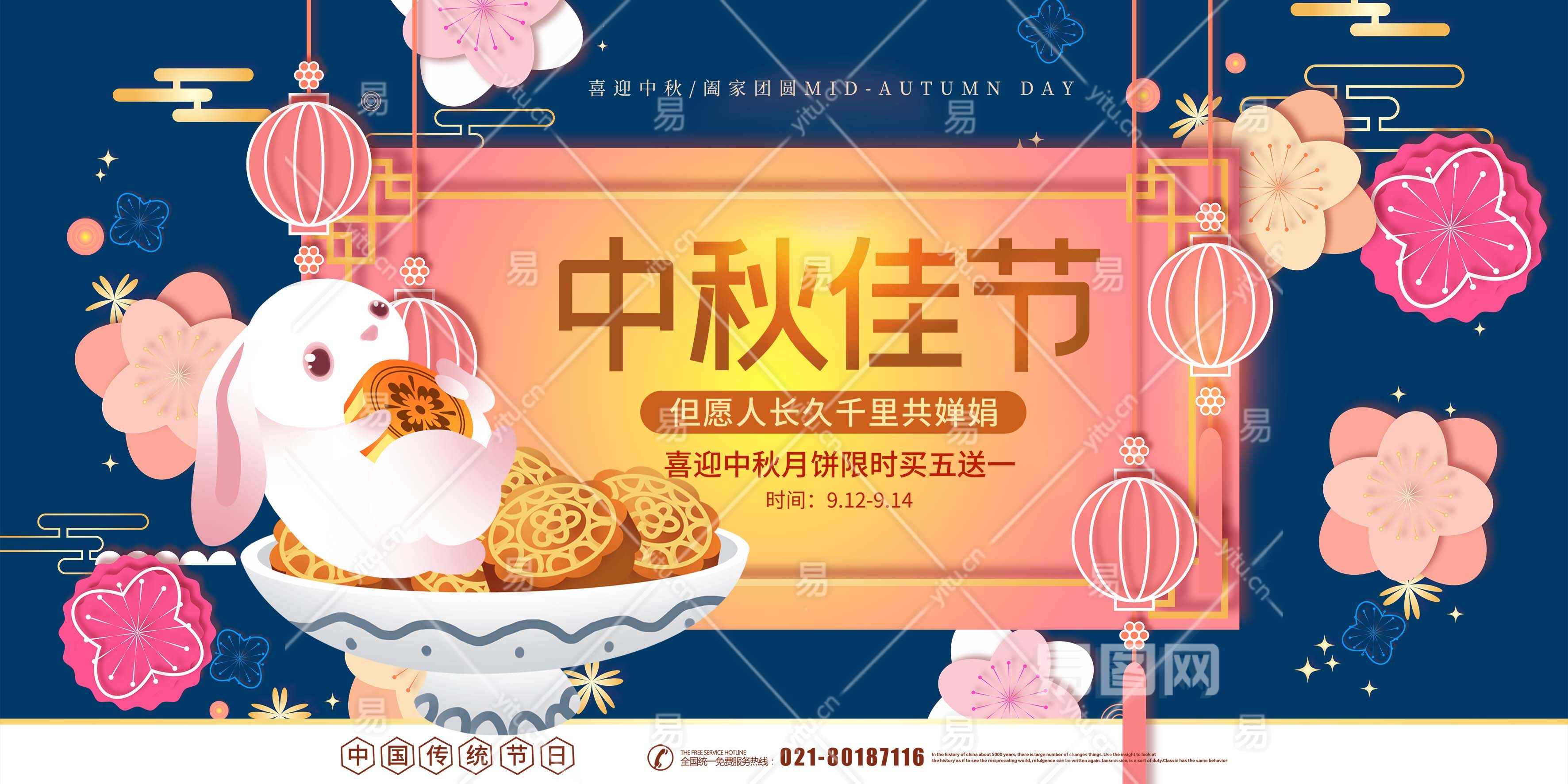 蓝色复古风中秋节促销宣传展板