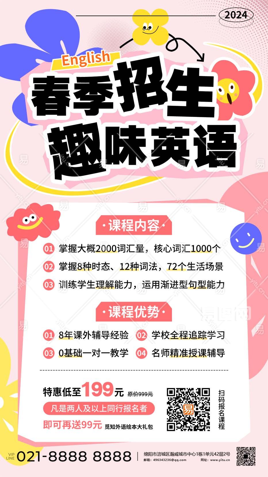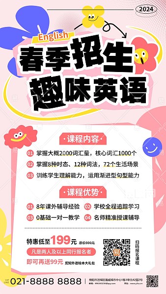 粉色简约插画风2024春季招生趣味英语促销活动展板