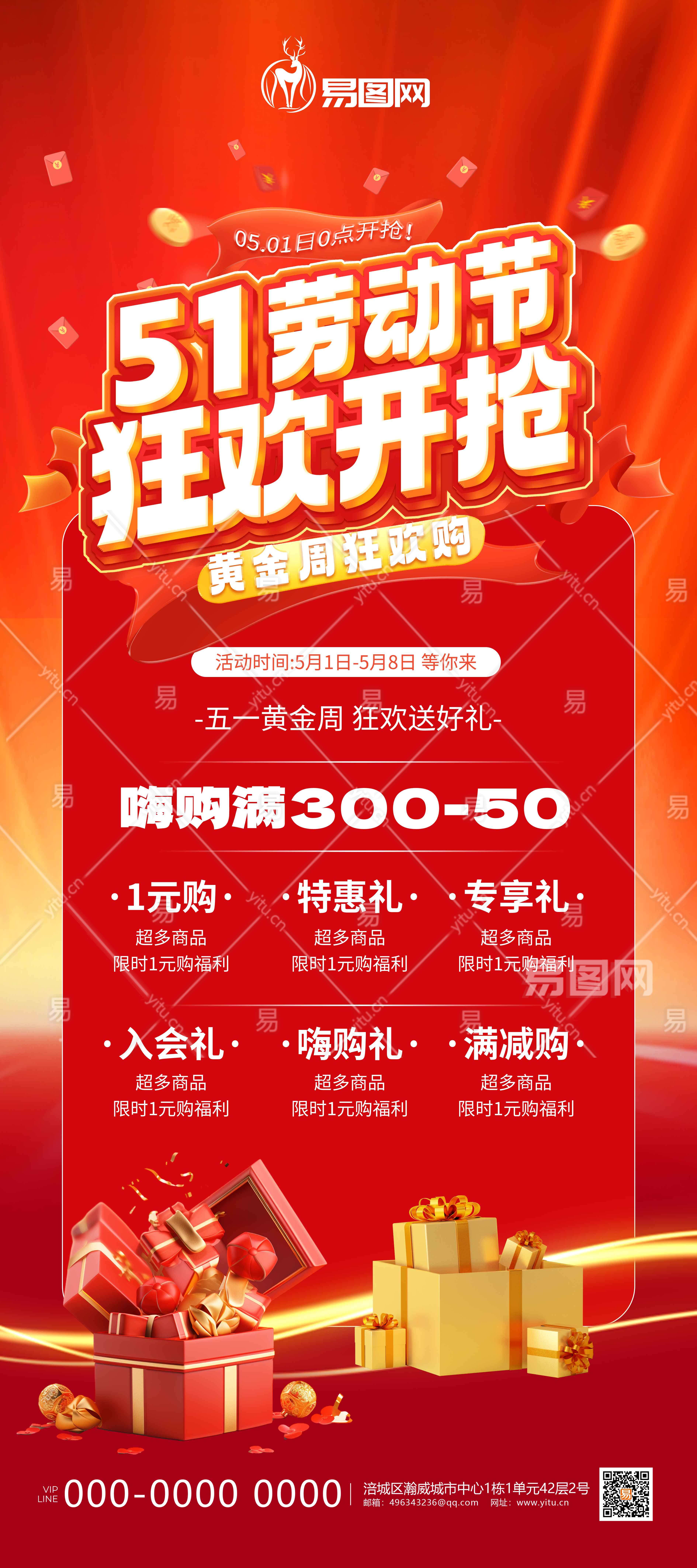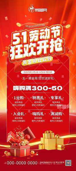 红色五一劳动节五一劳动节促销风广告易拉宝kt展架