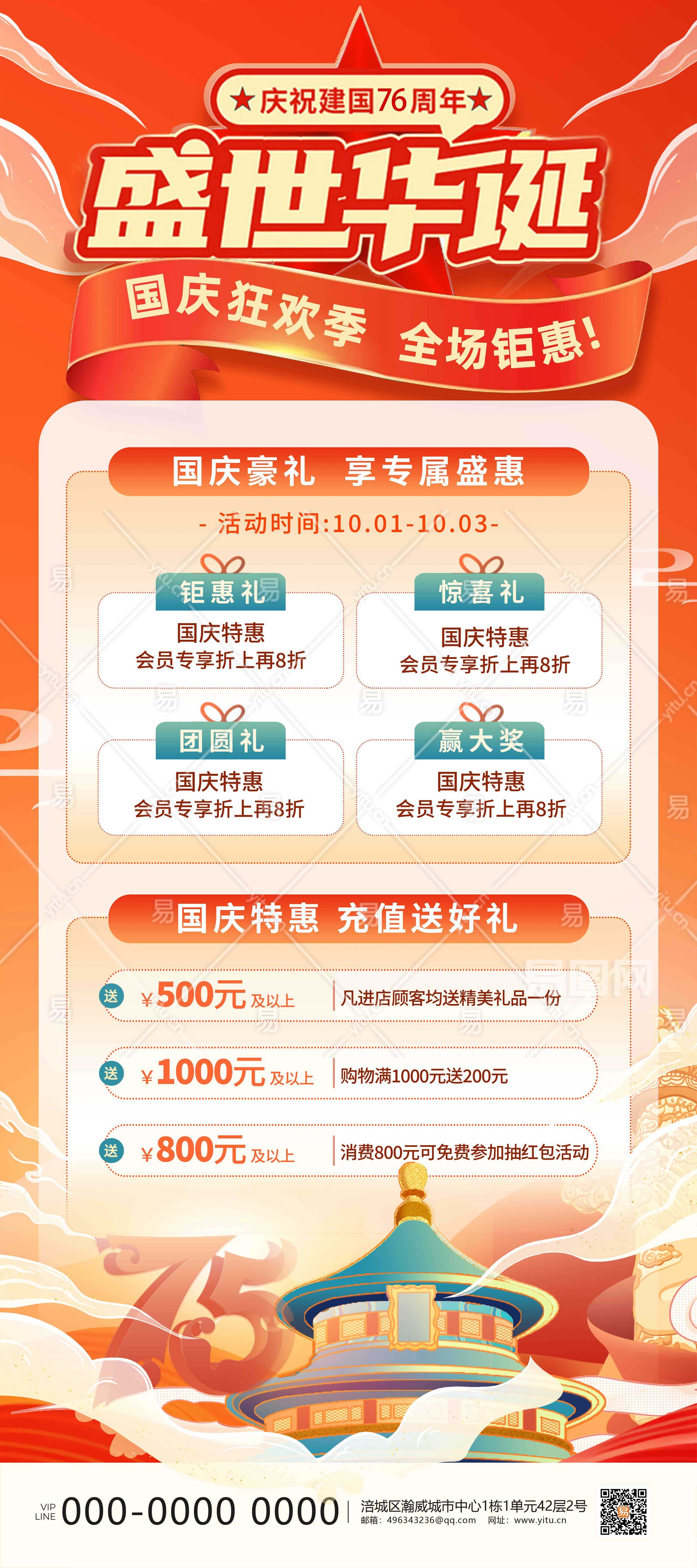 橙红迎75周年国庆盛世华诞钜惠促销活动X展架易拉宝
