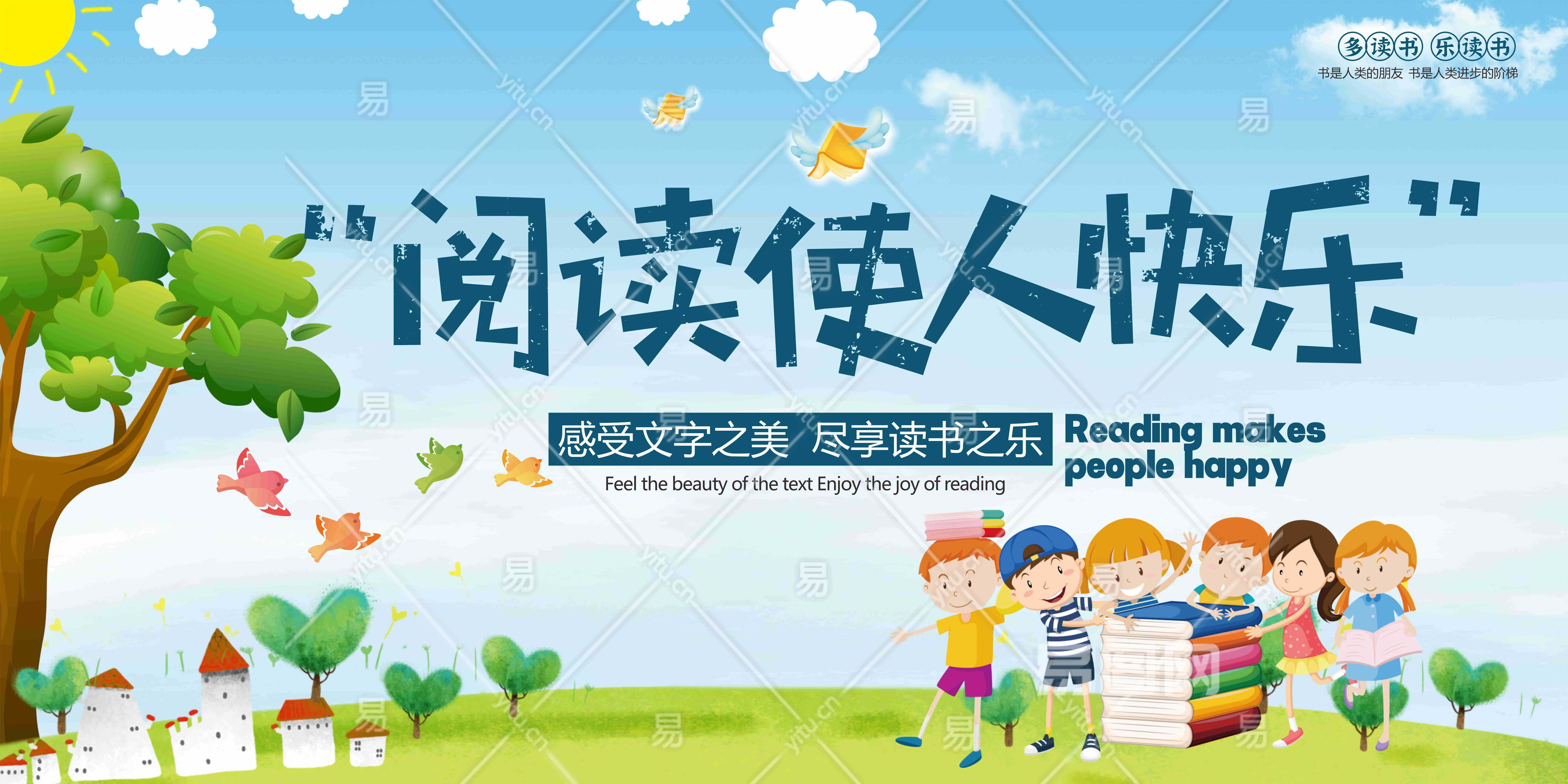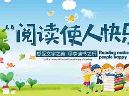 浅蓝精美卡通阅读使人快乐校园文化展板