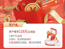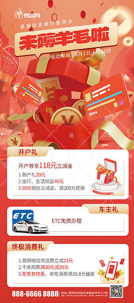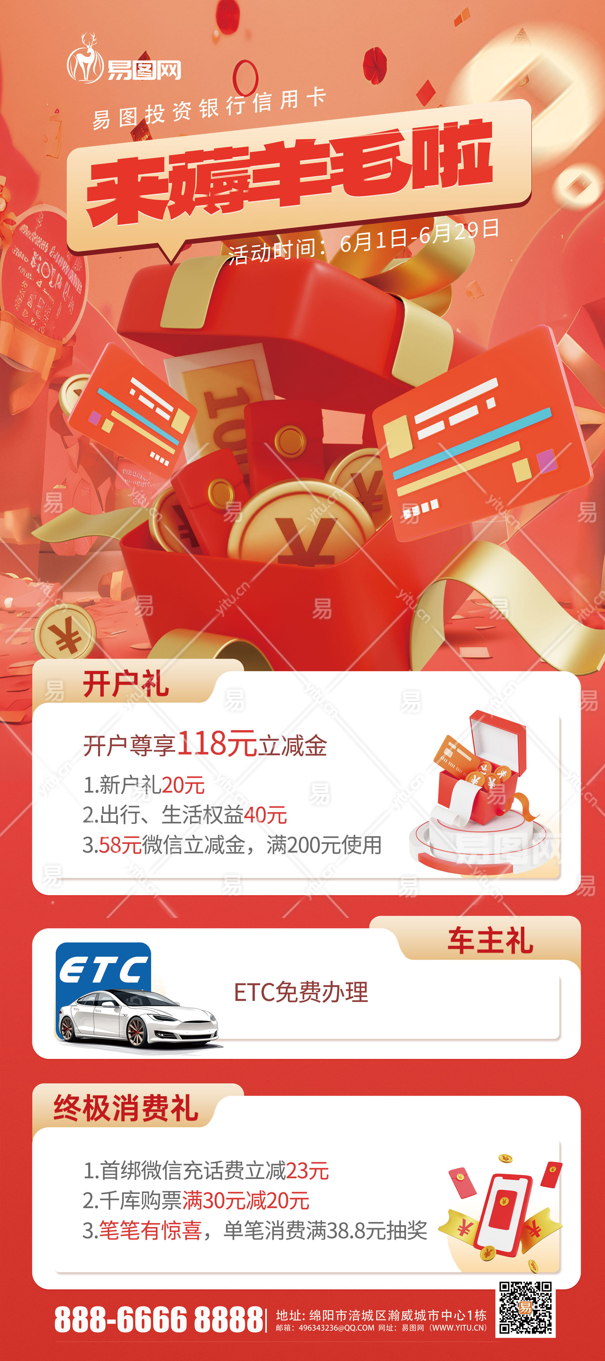 红色信用卡开卡福利礼盒银行卡金币红包简约大气展架宣传展板