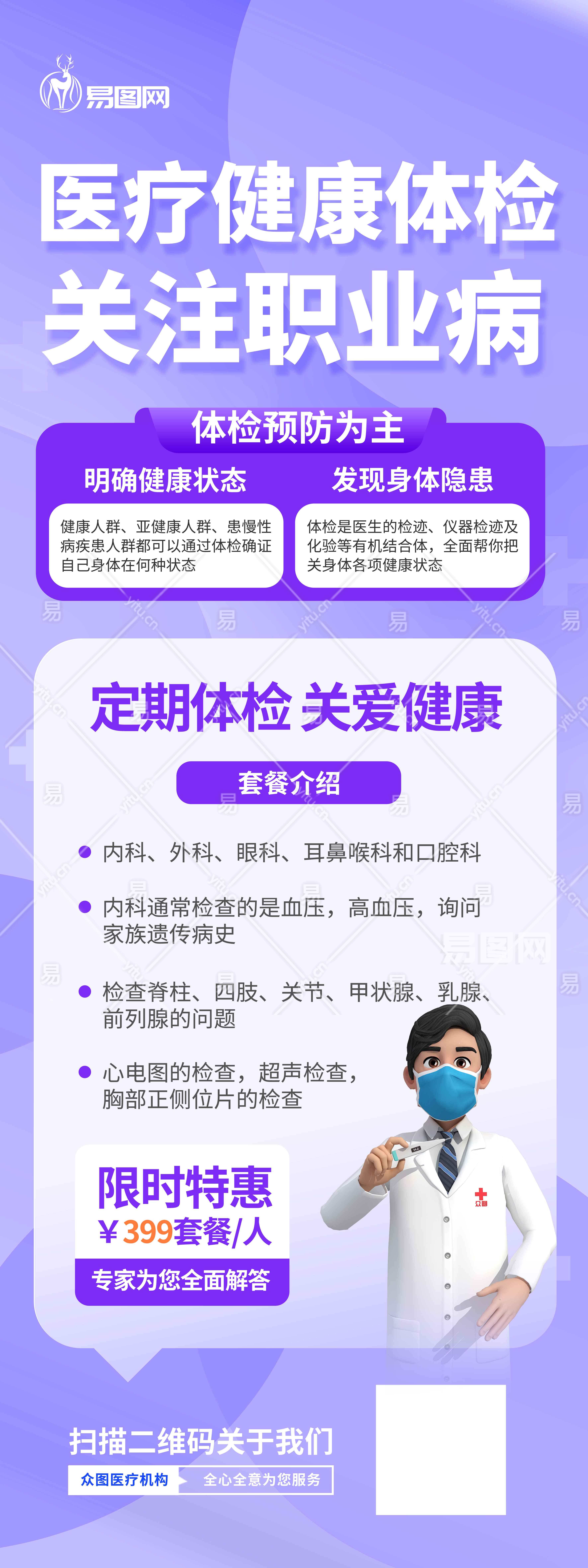 浅紫色定期体检医疗医院宣传展架易拉宝