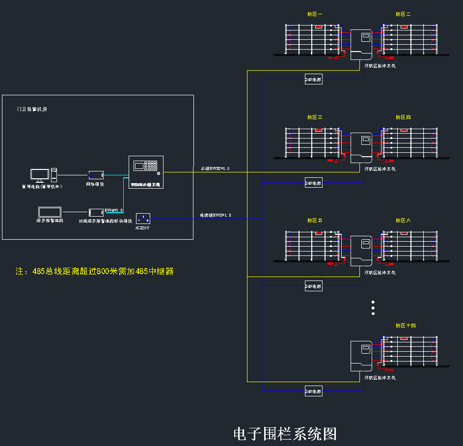 脉冲电子围栏CAD系统图,电子围栏CAD施工图纸下载