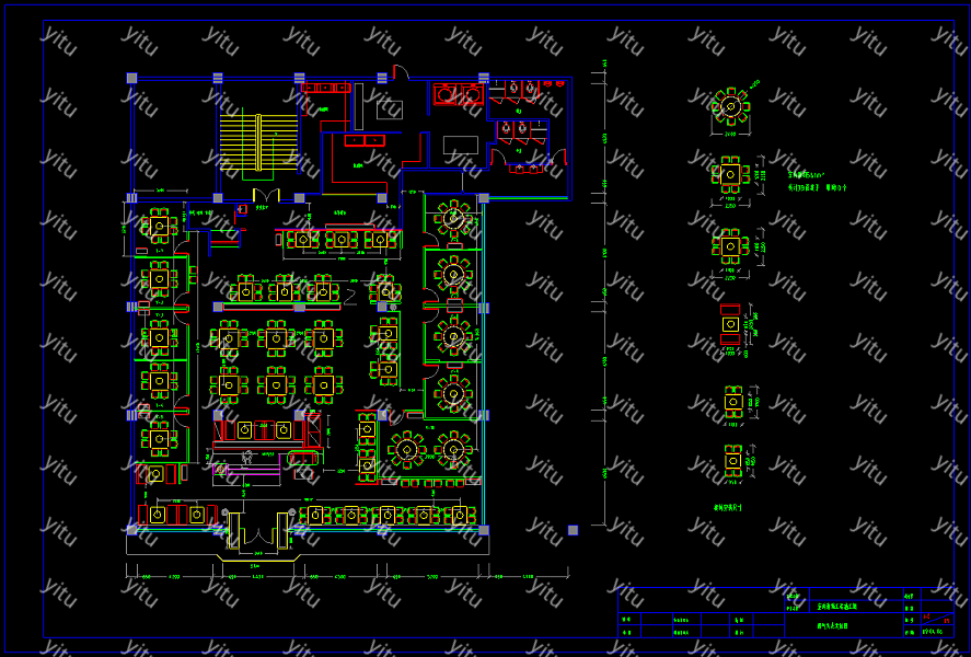 资料内容包括:全套CAD施工图,一灯具定位图、面铺装尺寸图,天布置尺寸图、原始平面尺寸图、电路图、立面索引图,室内隔墙尺寸图、天尺寸、灯具尺寸图、室内隔墙尺寸图、天然气点位图、吧台详图,小包间详图内容详实,可供参考,图纸中无错漏碰缺,具有较高的参考价值。