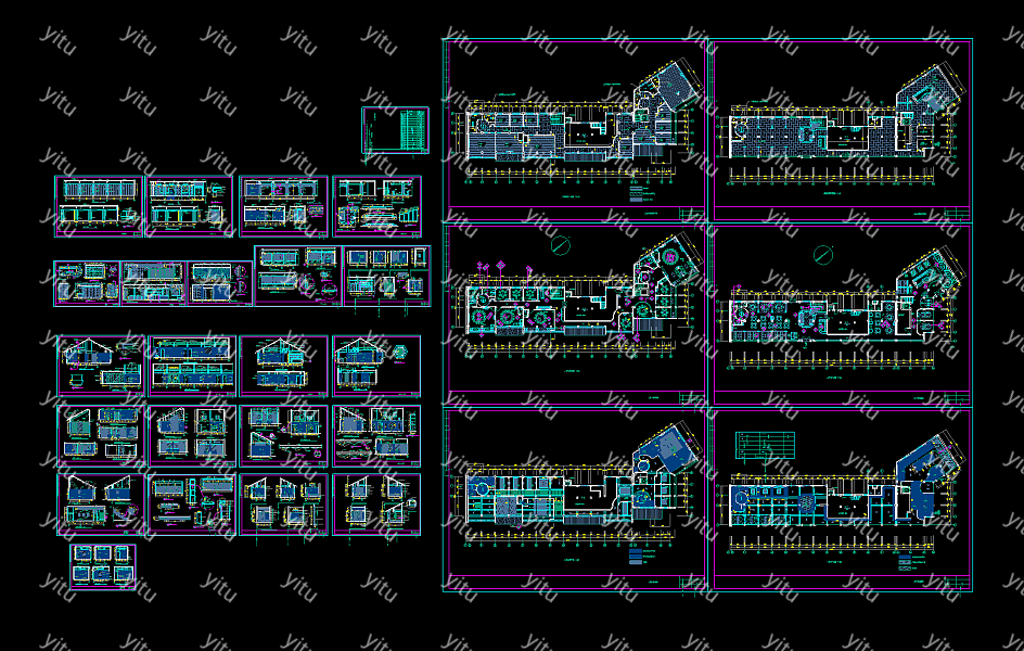 资料内容包括:全套施工图,二面拼布置图,一面拼布置图,二平面布置图,一平面布置图,二顶面布置图,豪华包厢立面图,走廊立面图,小号包厢立面图等,空间设计合理,内容详实,图纸中无错漏碰缺。作图规范,具有较高的参考价值,可供设计师参考。