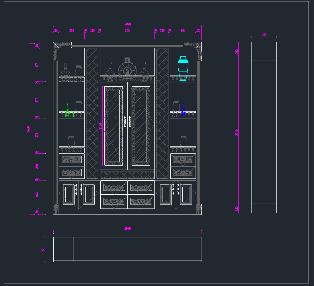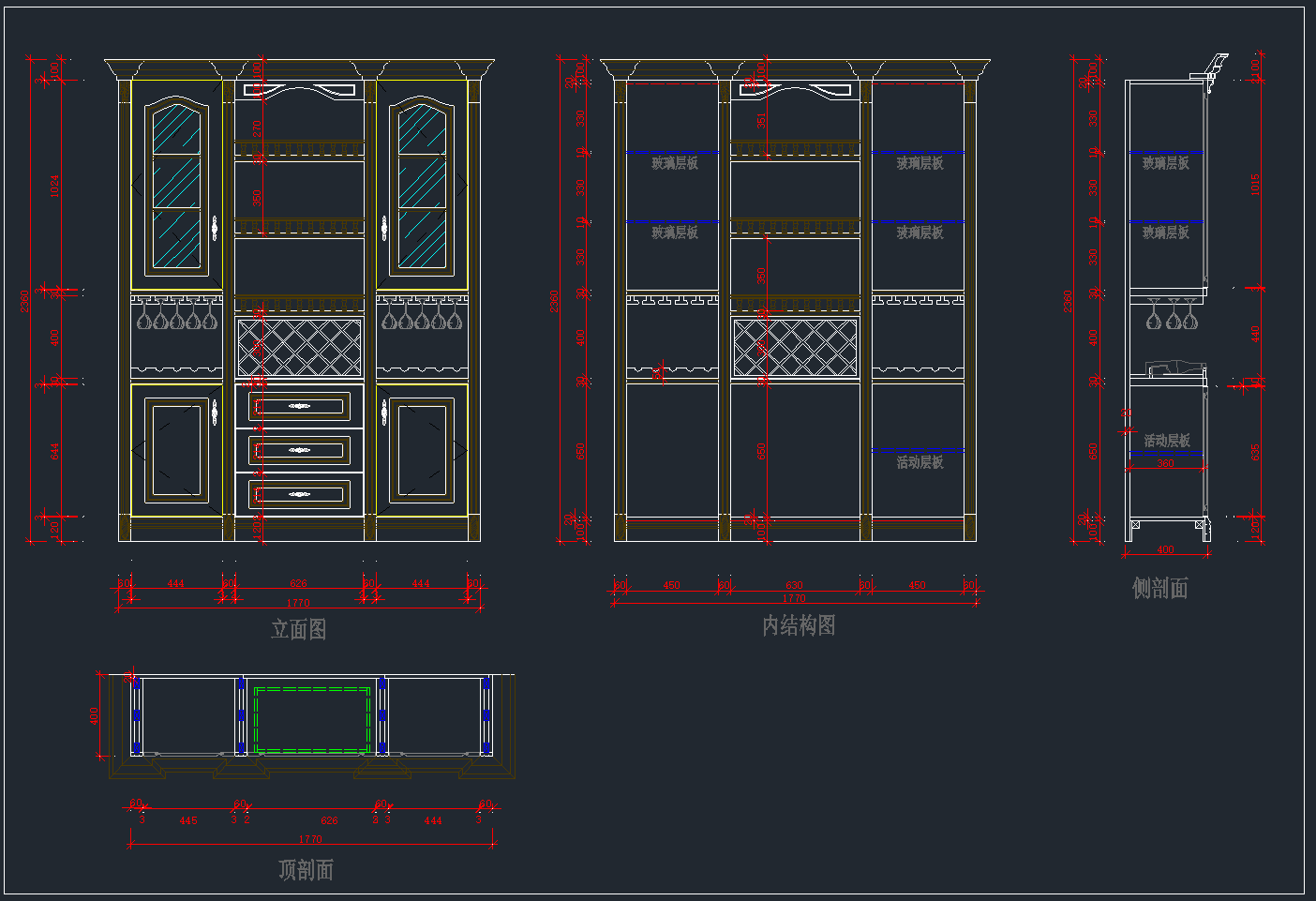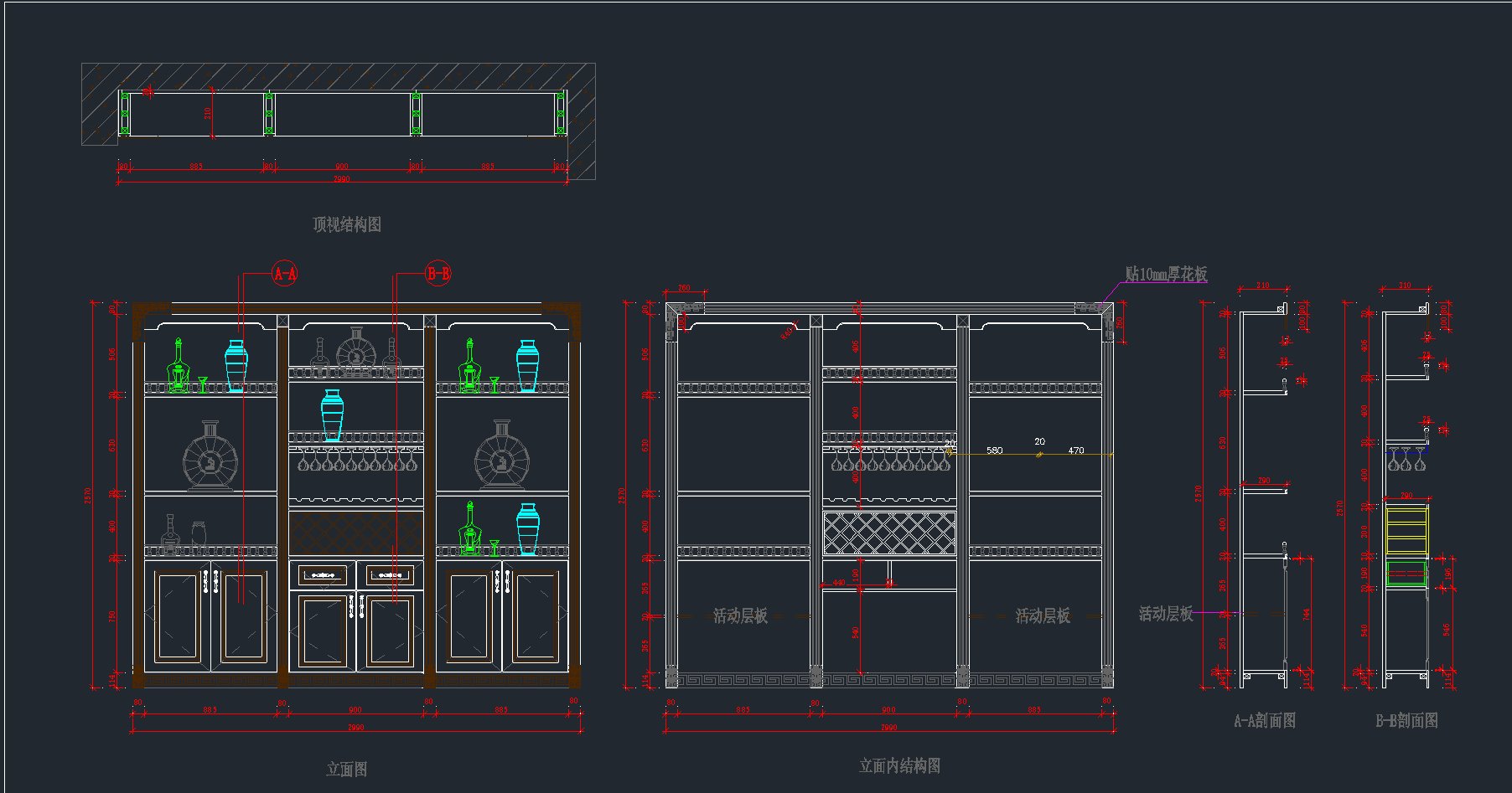 12套酒柜cad图库,酒店CAD图纸下载内容简介:图纸含有酒柜侧剖面图、立面图、主视图、文字标注统一,尺寸合理,具有较高的参考价值。