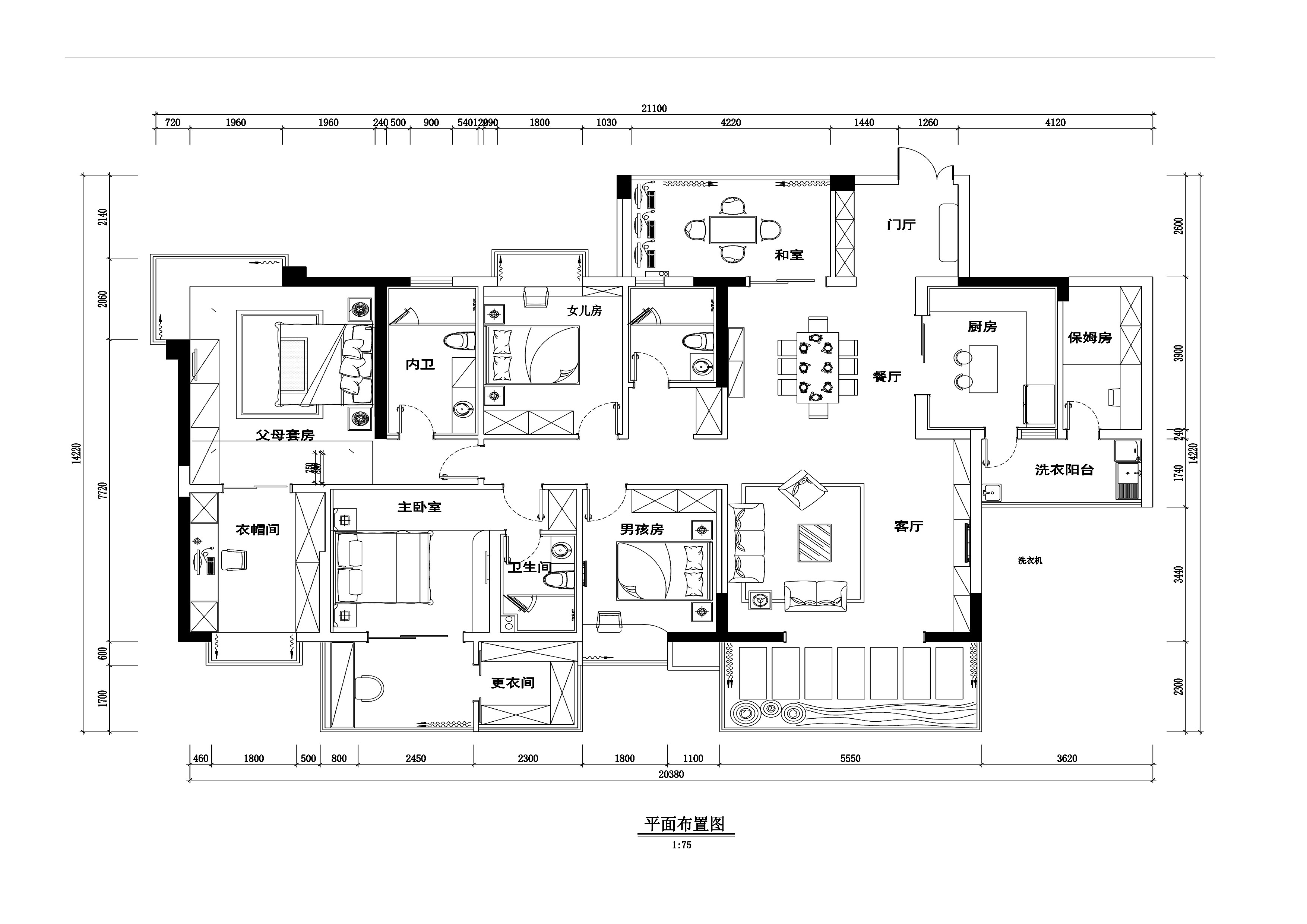 祥细客厅卧室家装户型图三居CAD,免费下载