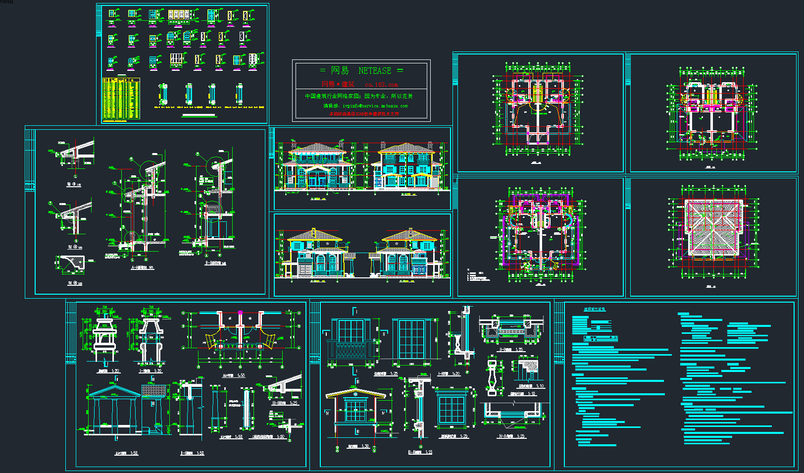 全套欧式精品别墅CAD施工图,别墅CAD建筑图纸下载内容简介:图纸含有屋顶平面图、剖面详图、立面图、节点大样图等,作图规范,内容详实,具有较高的参考价值。