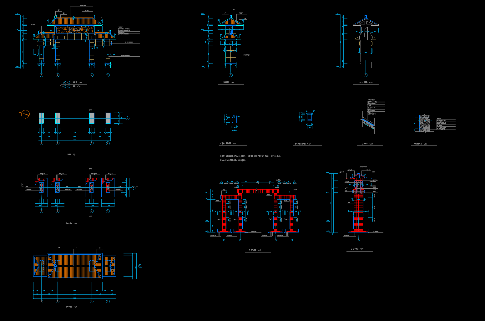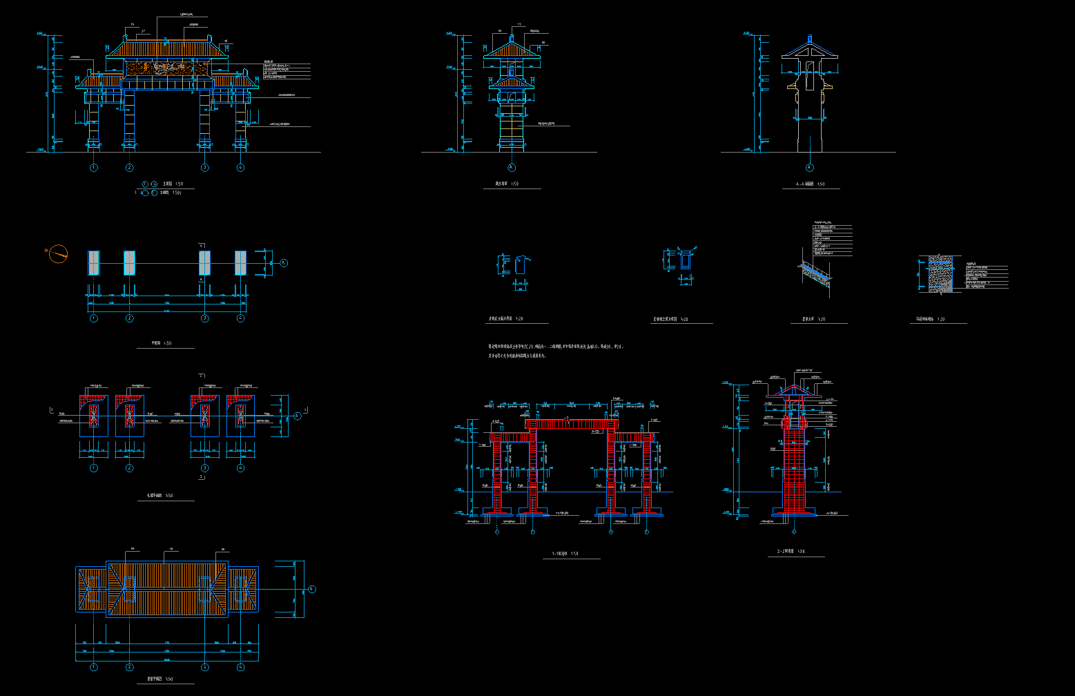 牌坊CAD施工图,牌坊CAD建筑图纸下载内容简介:图纸包含节点大样图、配筋图、立面图、剖面图、平面图等,作图规范,内容详实,可供参考。