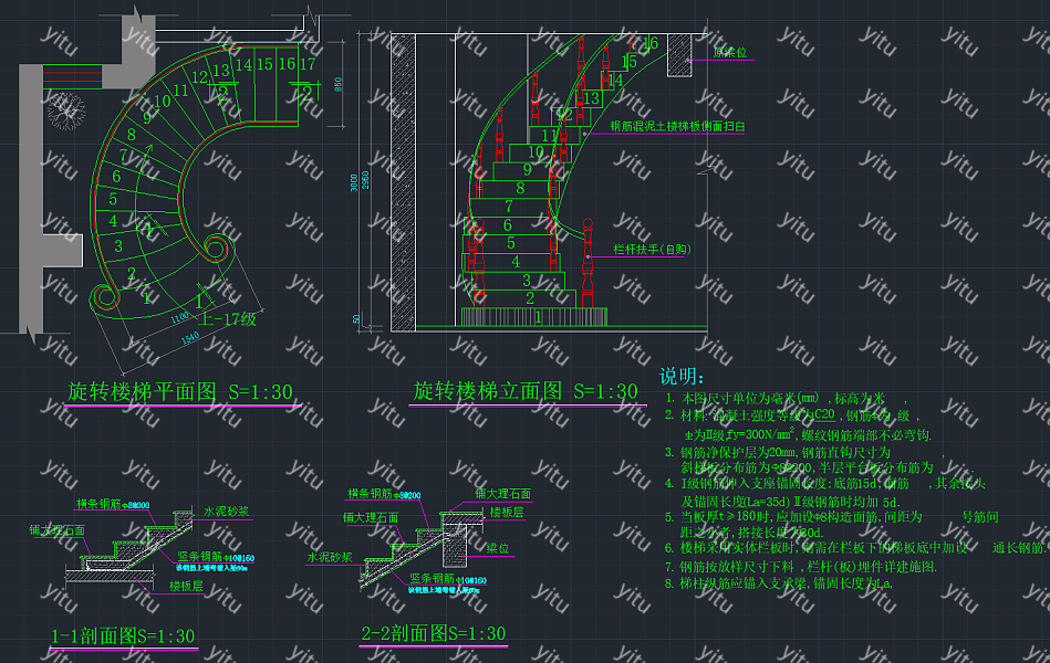常用梯配筋节点CAD施工图,cad梯配筋施工图纸下载内容简介:图纸包括旋转梯平立面和剖面的节点大样cad施工图纸,使画图更快捷表达效果更强烈,为施工图设计量身打造,具有极高的参考价值。易图网为您提供下载服务,好看实用。
