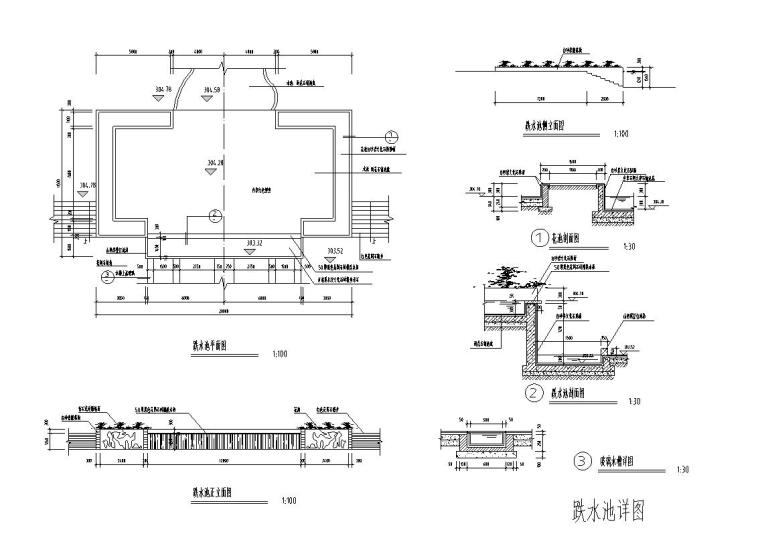 景观细部施工图—旱跌叠泉施工图设计。旱跌叠泉指通过盖板或岗岩等铺装孔喷出的柱来,以达到观赏喷泉的效果,且能够感受休闲空间的放松。进行景观细部施工,对旱跌叠泉做法详图、壁泉池平立剖面图、跌详图等进行设计