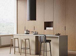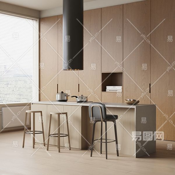侘寂风中岛吧台 倒台 吧椅 皮革椅 实木吧凳 油烟机 厨具 鸡蛋摆件 室内 吧台吧椅