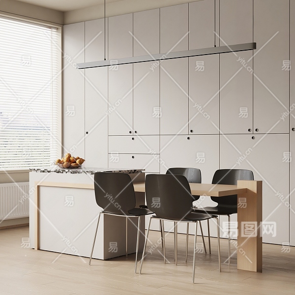 侘寂风中岛餐桌椅 倒台吧台 实木桌椅 水果果盘 现代餐厅 柜子 长条吊灯 室内 中岛台