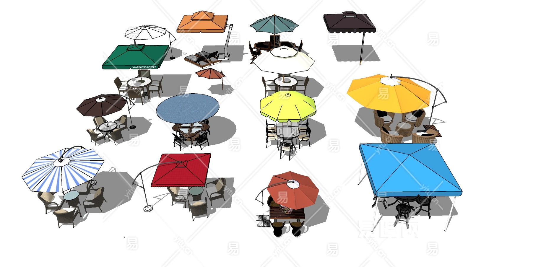 14户外景观遮阳伞合集 海边度假休息区 露台休闲区 户外桌椅 躺椅 餐桌 欧式花园桌椅 站岗遮阳伞 户外咖啡桌椅su草图模型下载