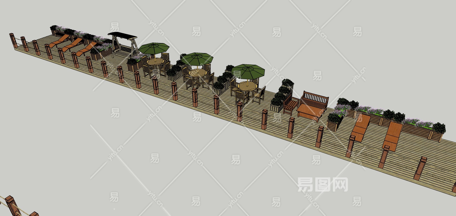 08沙滩海边度假 海景度假观赏平台 滨水公园休息区 户外休闲桌椅 遮阳伞 沙滩椅su草图模型下载