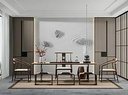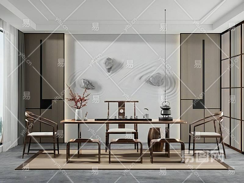 新中式家居茶室茶桌椅组合茶具石头枯山水圈椅SU模型