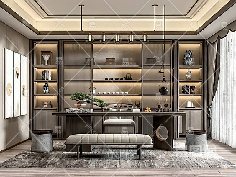 新中式家居茶室茶桌椅组合装饰画摆柜吊灯盆景SU模型