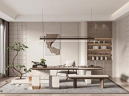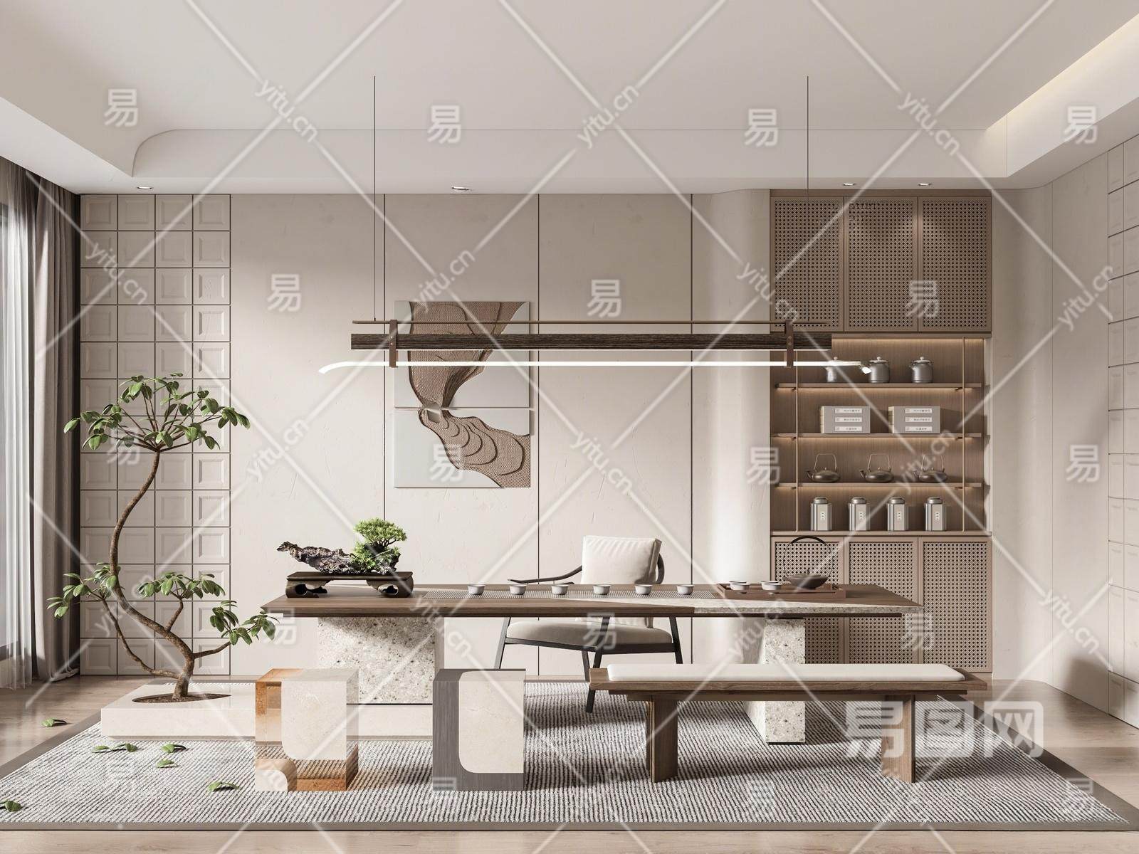 新中式茶室 茶桌椅组合 吊灯 墙饰 茶具