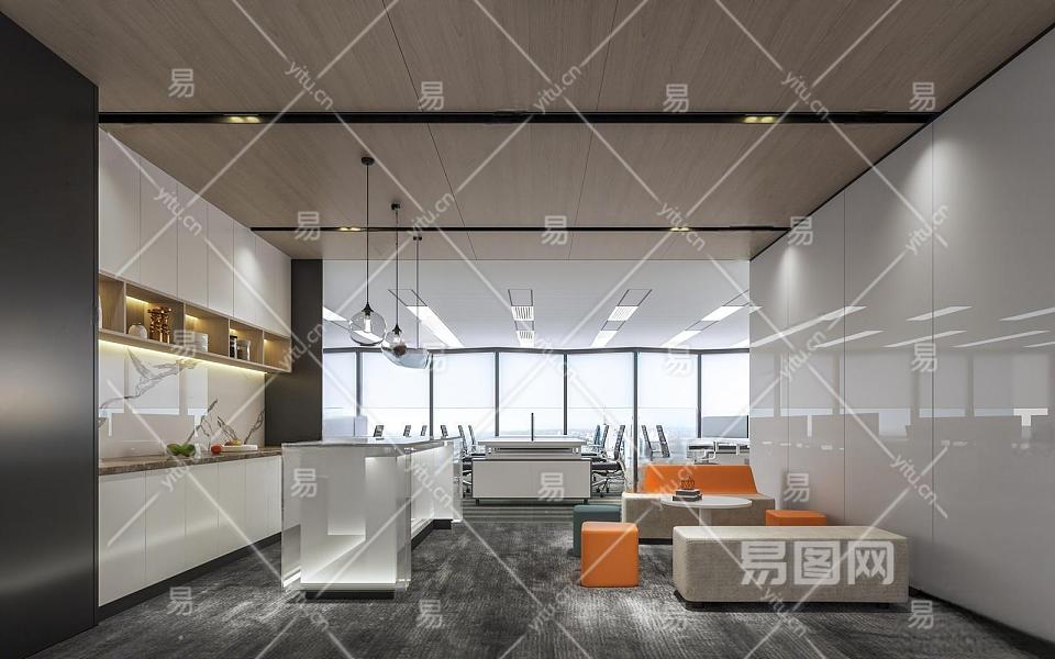 现代办公茶水间 休息区 公共办公区 沙发茶几组合 吧台椅 橱柜