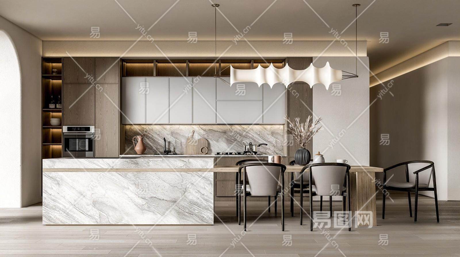 侘寂风开放式厨房 橱柜 吊灯 厨具 灶台 花艺摆件