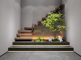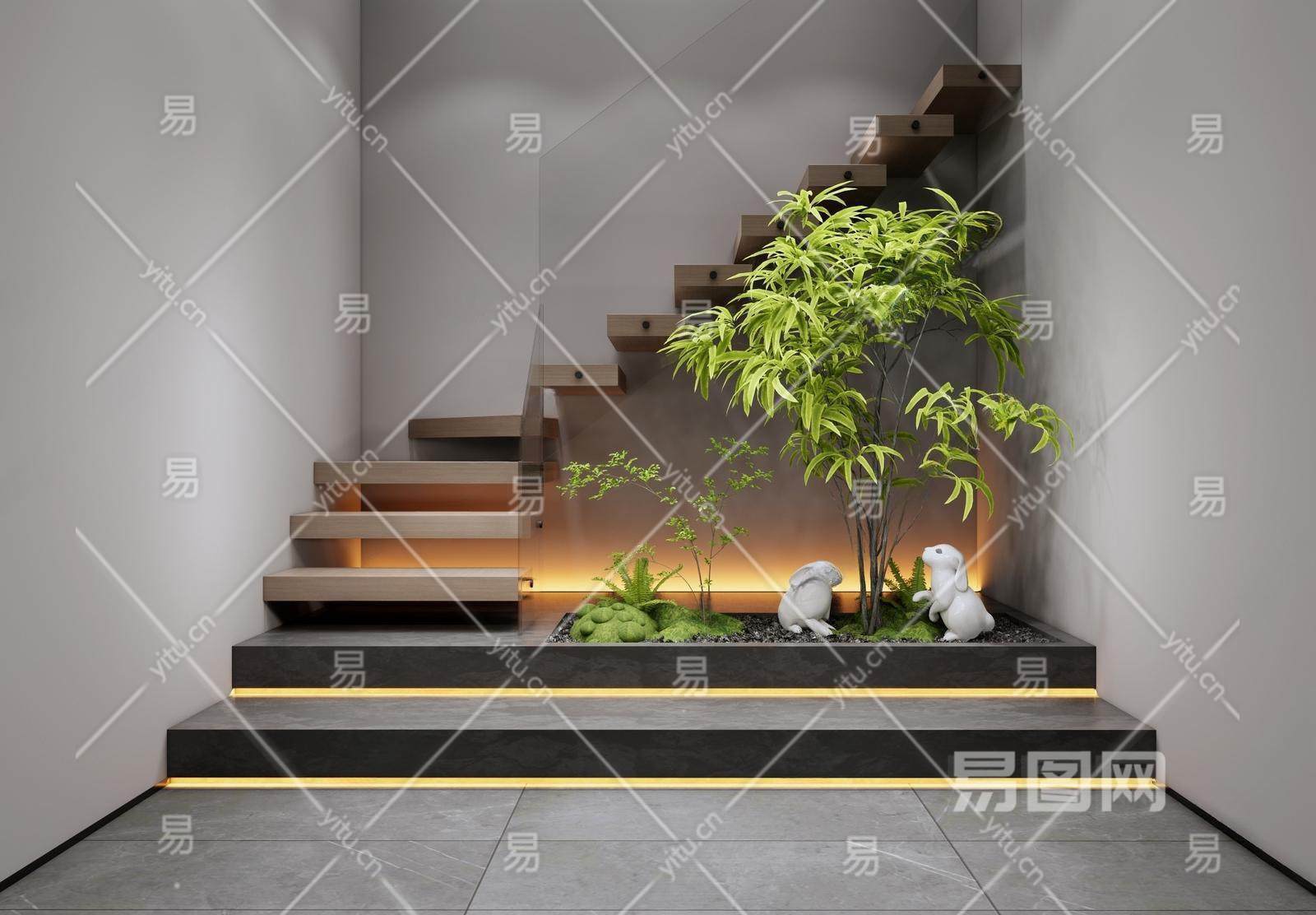 现代楼梯间 景观造景 转角木楼梯 植物景观 灌木 小兔雕塑