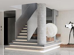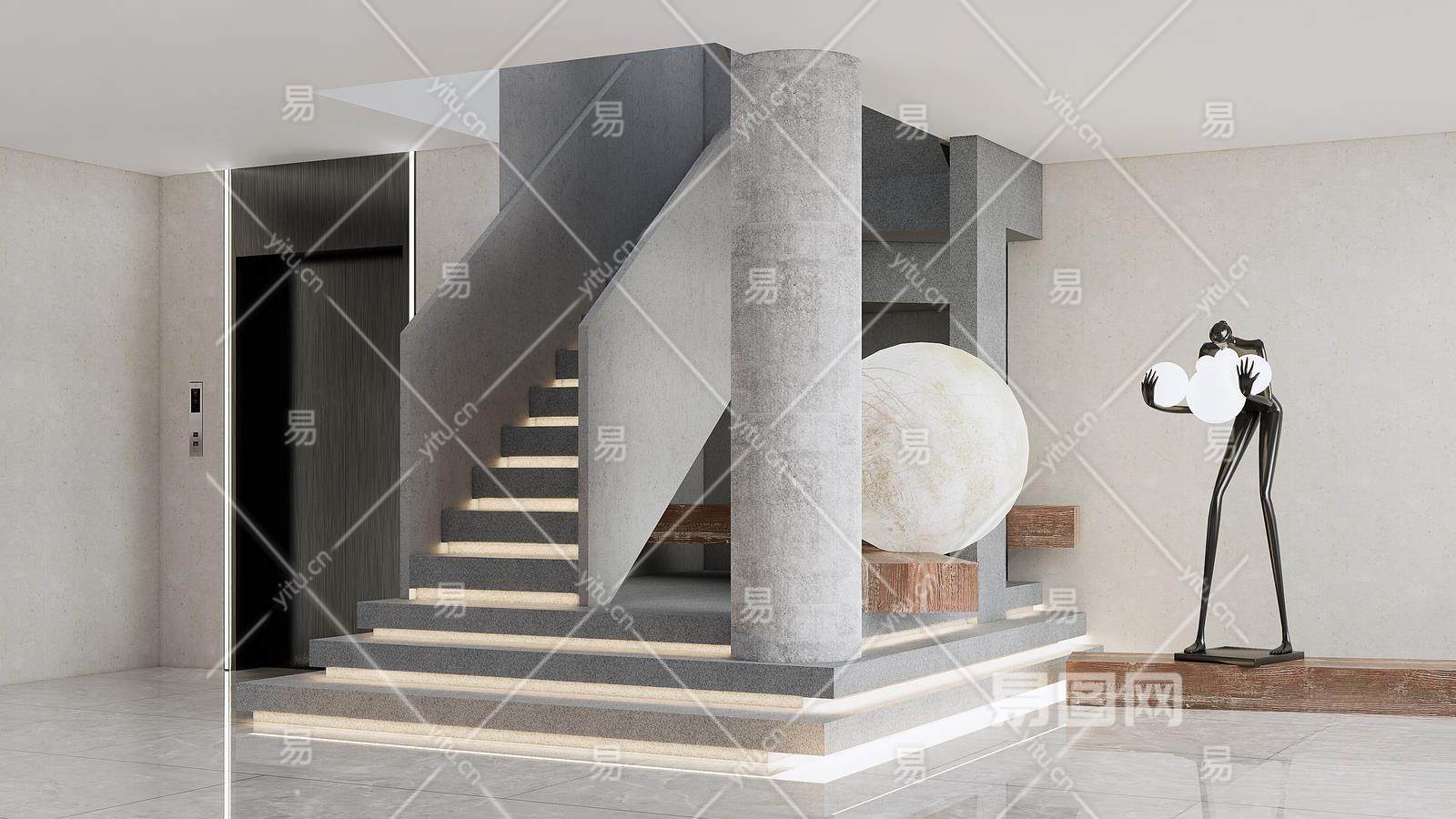 现代楼梯间 电梯间 艺术水泥楼梯 月球灯摆件