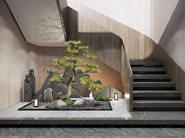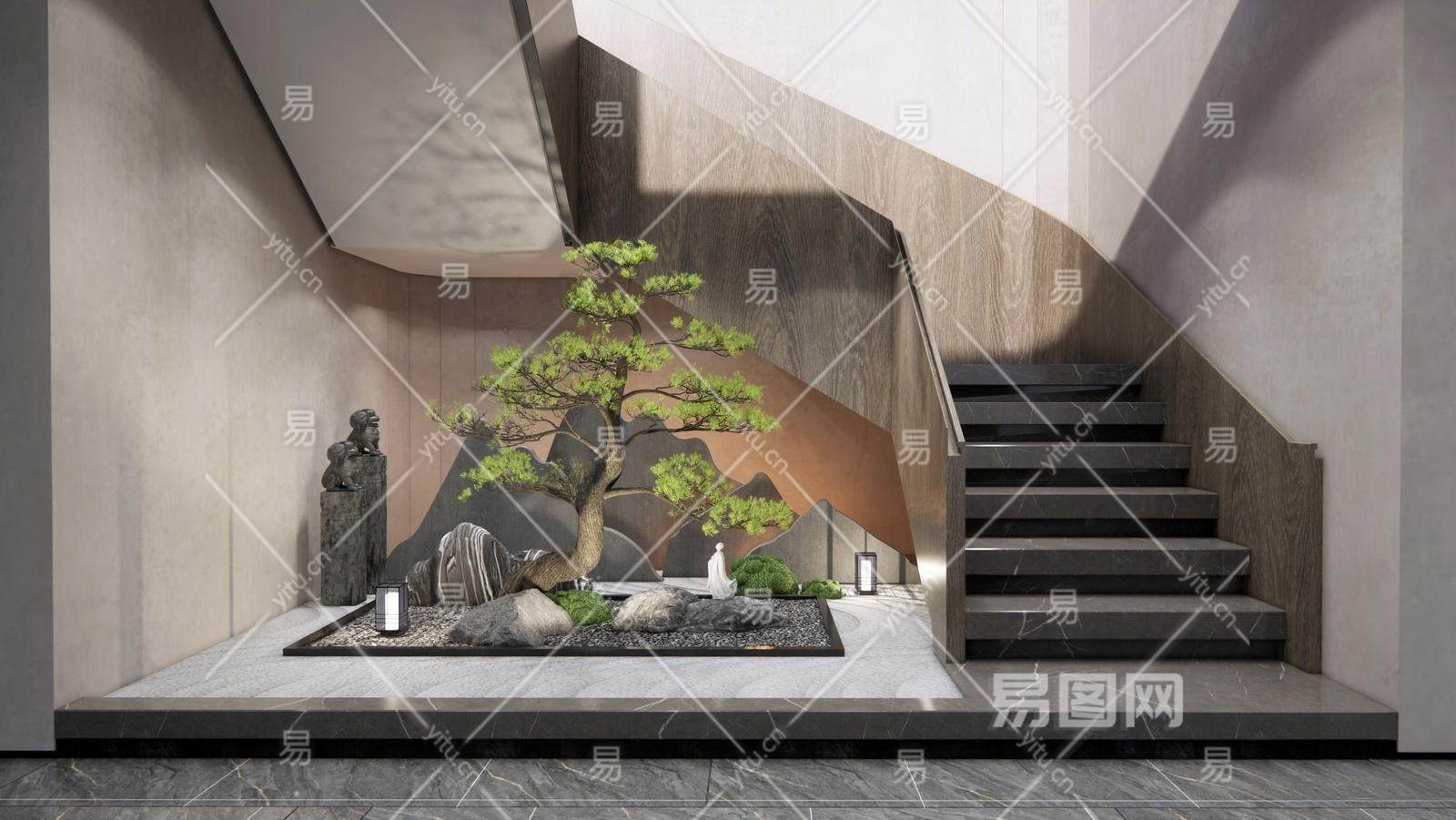新中式楼梯 玄关造景 假山 石头 迎客松