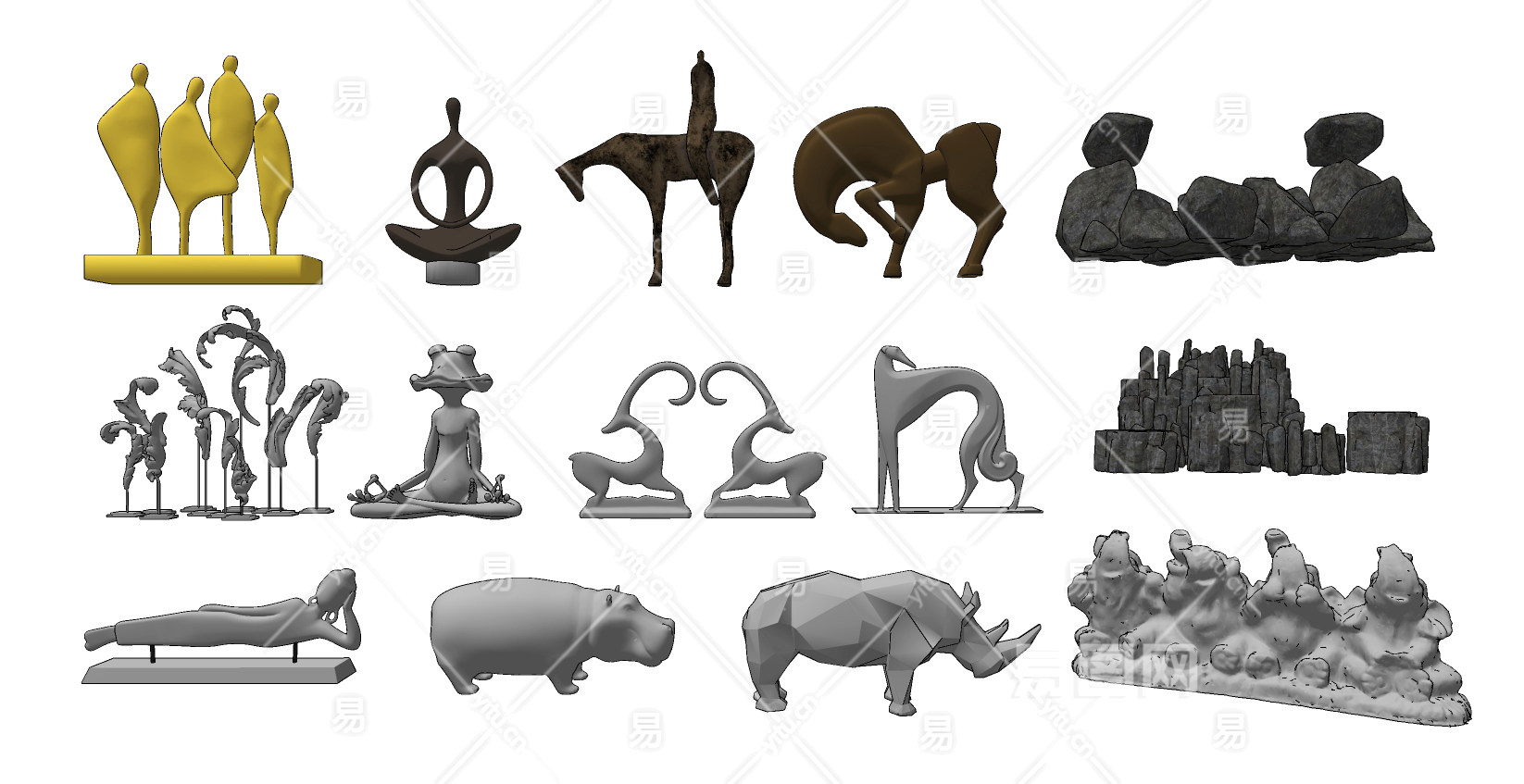 现代雕塑,假山,抽象人物骏马,饰品摆件su草图模型下载