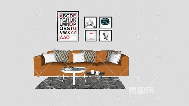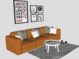 橘色三人座沙发照片墙组合SU模型下载_sketchup草图大师SKP模型