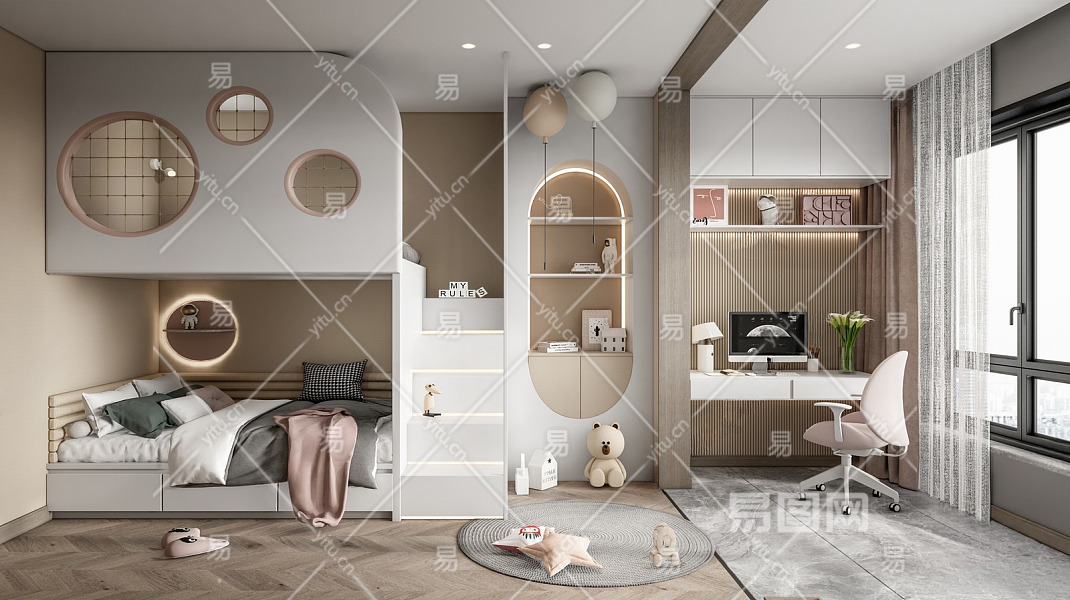 现代儿童房 儿童高低床 上下床 书桌椅 吊灯 玩具摆件 窗帘