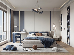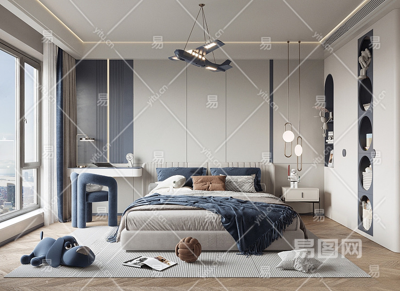 现代男孩儿童房 儿子房 儿童床 儿童玩具 儿童书桌椅 儿童吊灯 儿童衣柜
