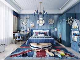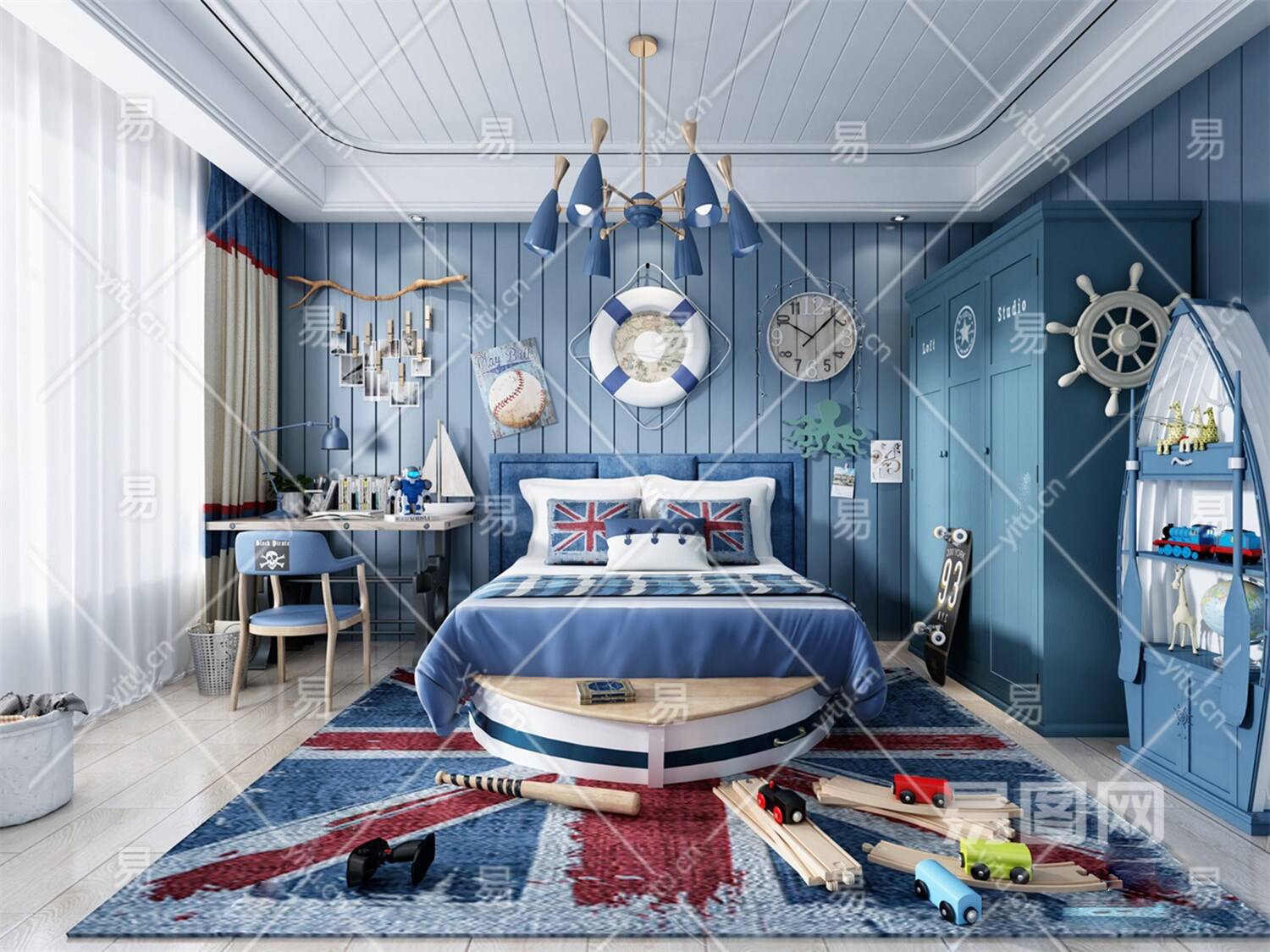 地中海儿童房 男孩房 小孩房 卧室 书桌椅 窗帘 装饰柜 吊灯