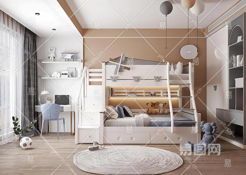 现代儿童房 上下铺 上下床 书桌椅 书柜 玩具 衣柜 摆件 气球