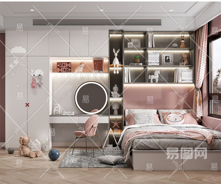 现代儿童房 女儿房 双人床 书桌 雕塑 摆件 玩偶