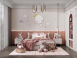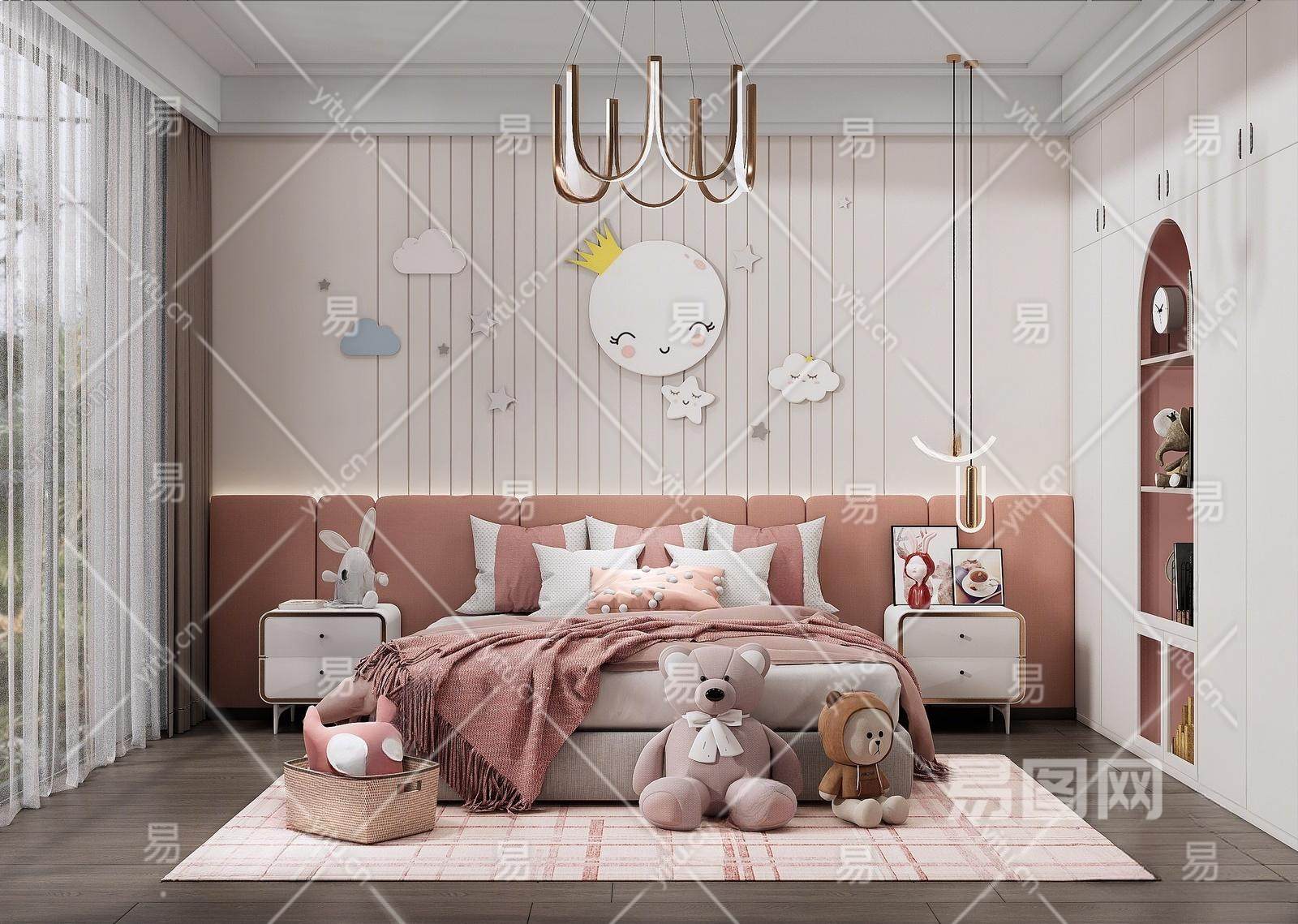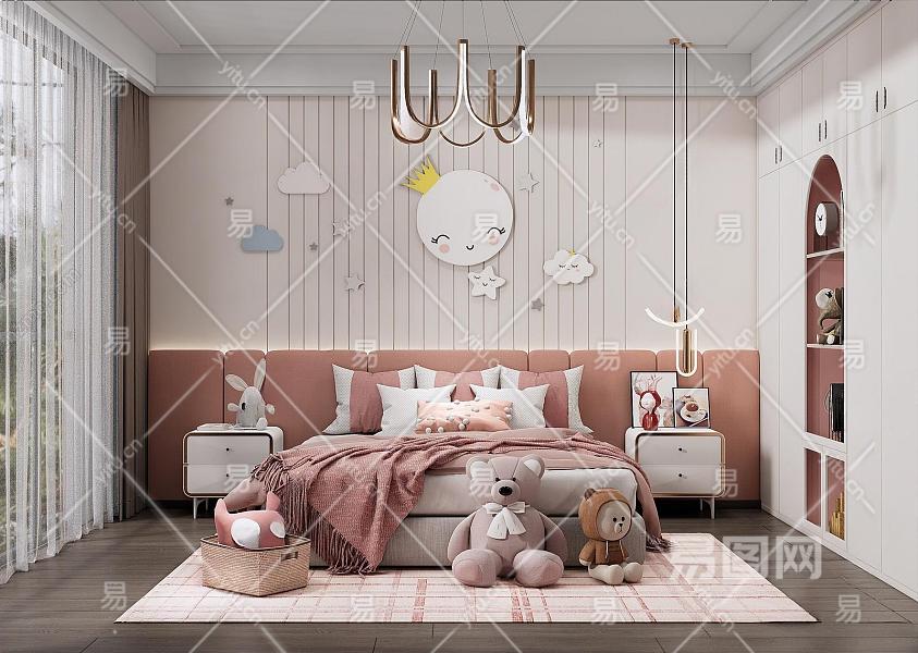 现代儿童房 女儿房 双人床 雕塑摆件 玩偶 吊灯 衣柜 床头柜 地毯
