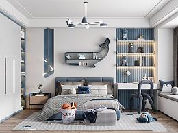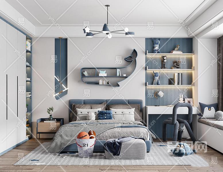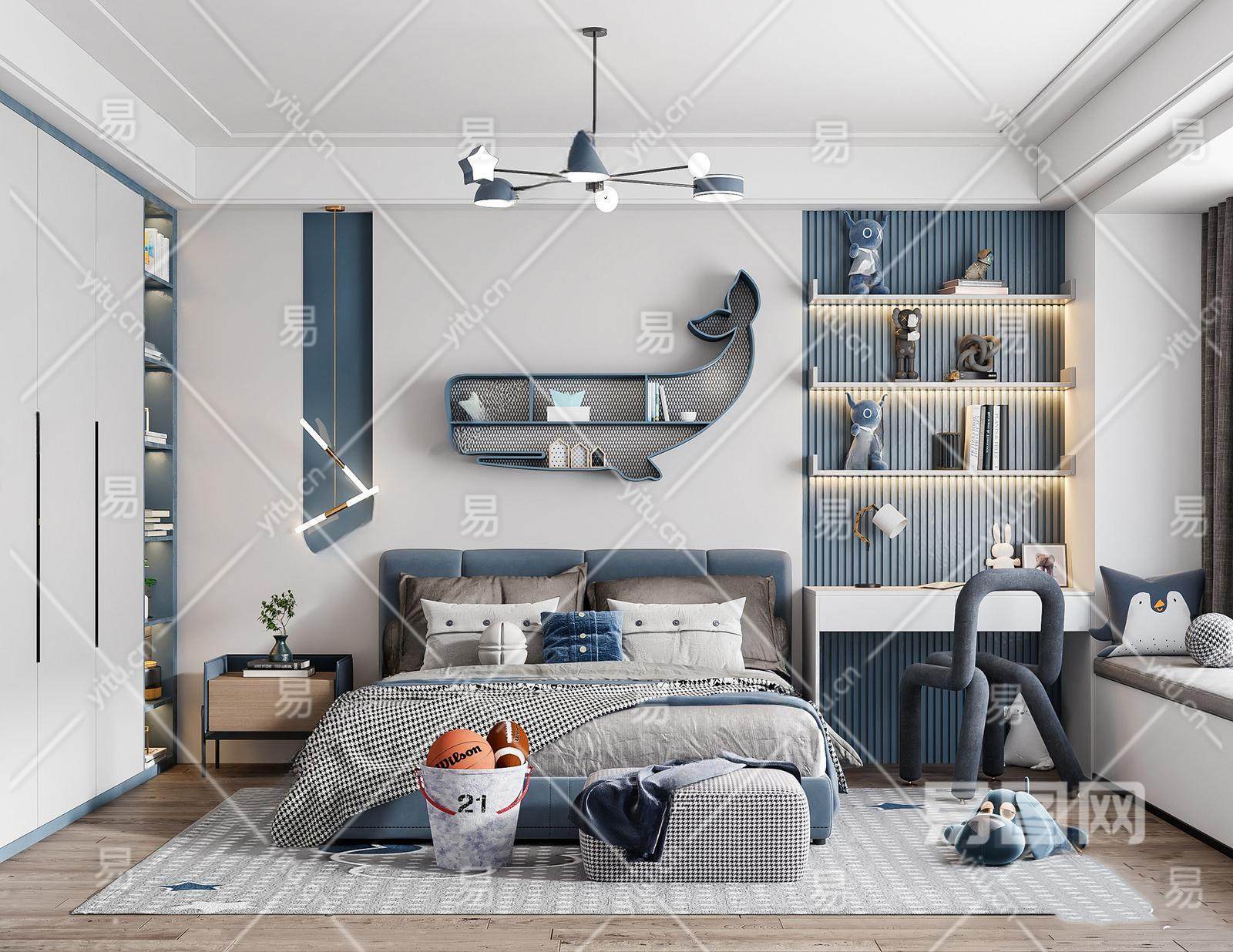 现代男孩儿童房 床头背景墙 台灯 床具 梳妆台 衣柜 吊灯